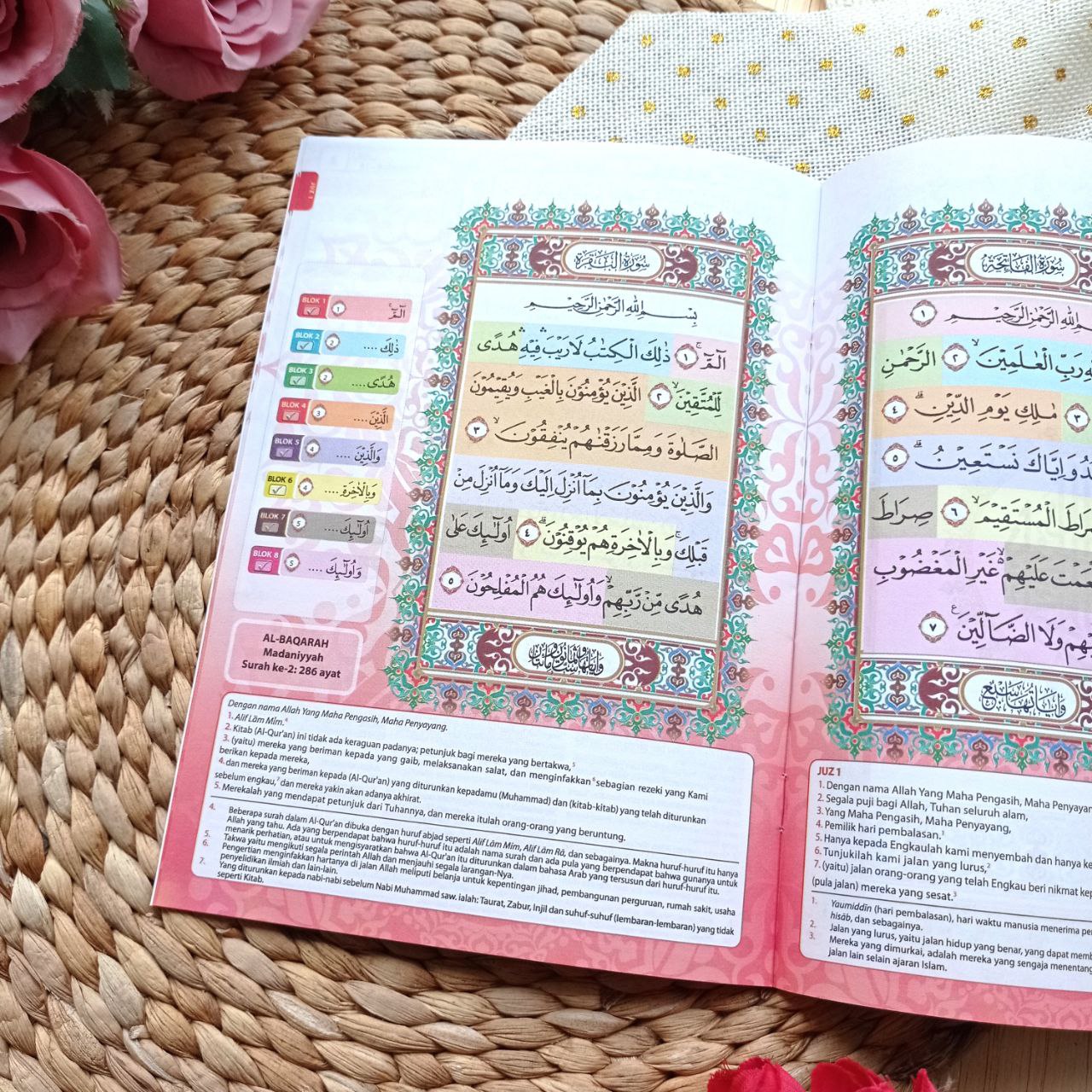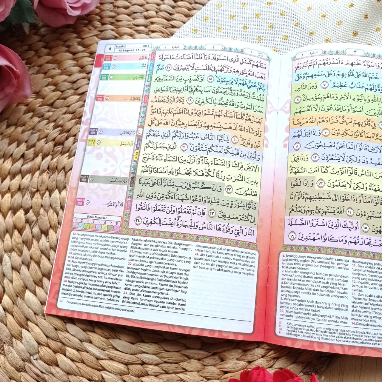 Al-Quran ini terdiri dari 8 blok warna dengan waqaf ibtida yang diberi bendera warna. Selain itu, Al-Quran ini juga dilengkapi dengan keyword awal ayat serta kolom murojaah untuk membantu pembaca memperdalam pemahaman dan hafalan Al-Quran. Rasm Utsmani yang digunakan pada Al-Quran ini juga standar Indonesia, sehingga memudahkan pembaca untuk memahami dan mempelajari Al-Quran dengan baik.