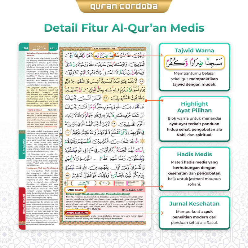 Seiring meningkatnya kesadaran umat akan gaya hidup sehat ala Rasulullah ﷺ, Qur’an Cordoba menghadirkan Mushaf Tematik Medis pertama di Indonesia—lebih dari sekadar mushaf biasa. Ini adalah panduan hidup sehat yang berbasis wahyu, hadis medis, dan jurnal kesehatan terpercaya.