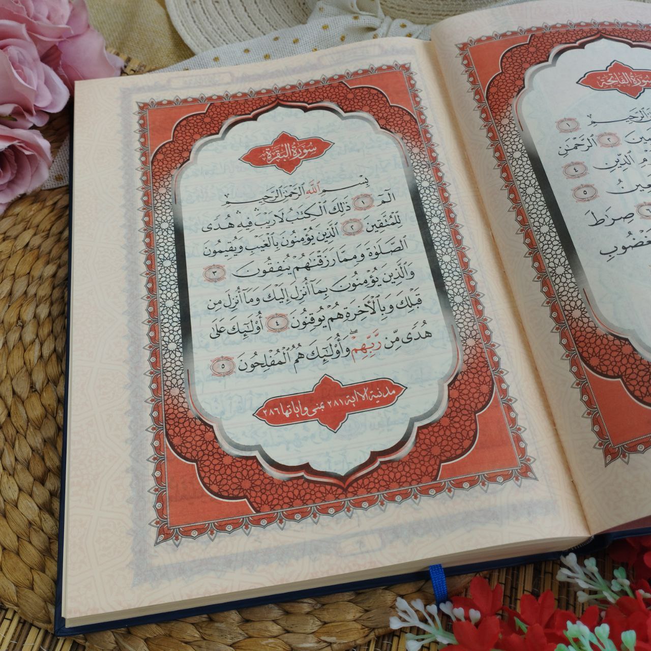 - Cover: Hard Cover yang kokoh, melindungi mushaf agar lebih awet dan nyaman untuk digunakan sehari-hari.