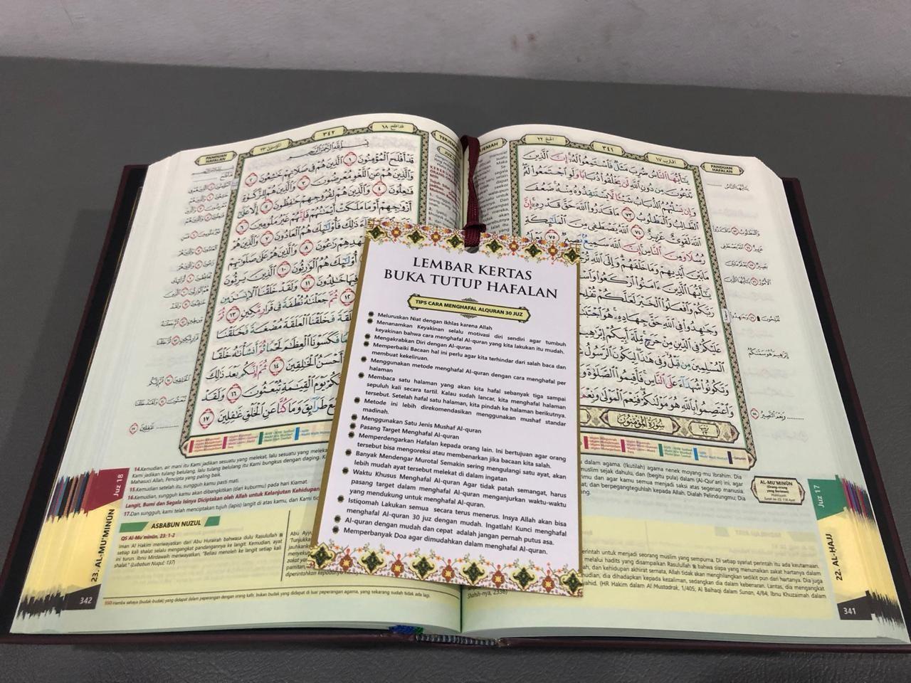 Al-Qur’an Mushaf Hafalan Utsmani Madinah Terjemah Tajwid A5 ini Dilengkapi dengan Terjemah, Tajwid warna, Asbabun Nuzul, Al-Hadits Fadhilah Ayat, Panduan Hafalan, menggunakan Rasm Utsmani Madinah dengan jumlah baris setiap halamannya terdapat 15 baris (standar).