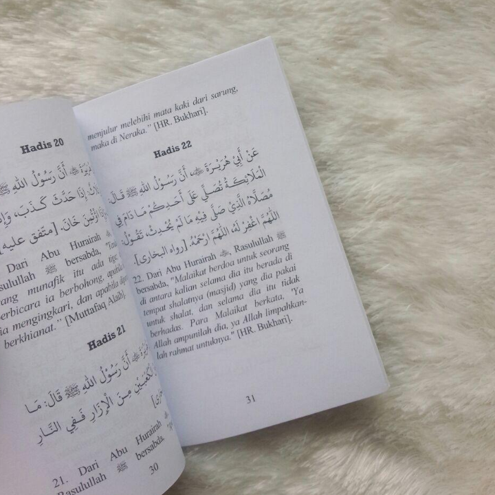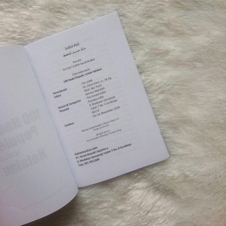 Buku ini dapat dijadikan pegangan serta rujukan dalam menghafal hadits pada kelas diniyah, kajian di masjid, kampus, sekolah atau pesantren. Dapat pula dijadikan hafalan untuk kelompok pengajian ibu-ibu atau bapak-bapak, agar akrab dengan hadits.