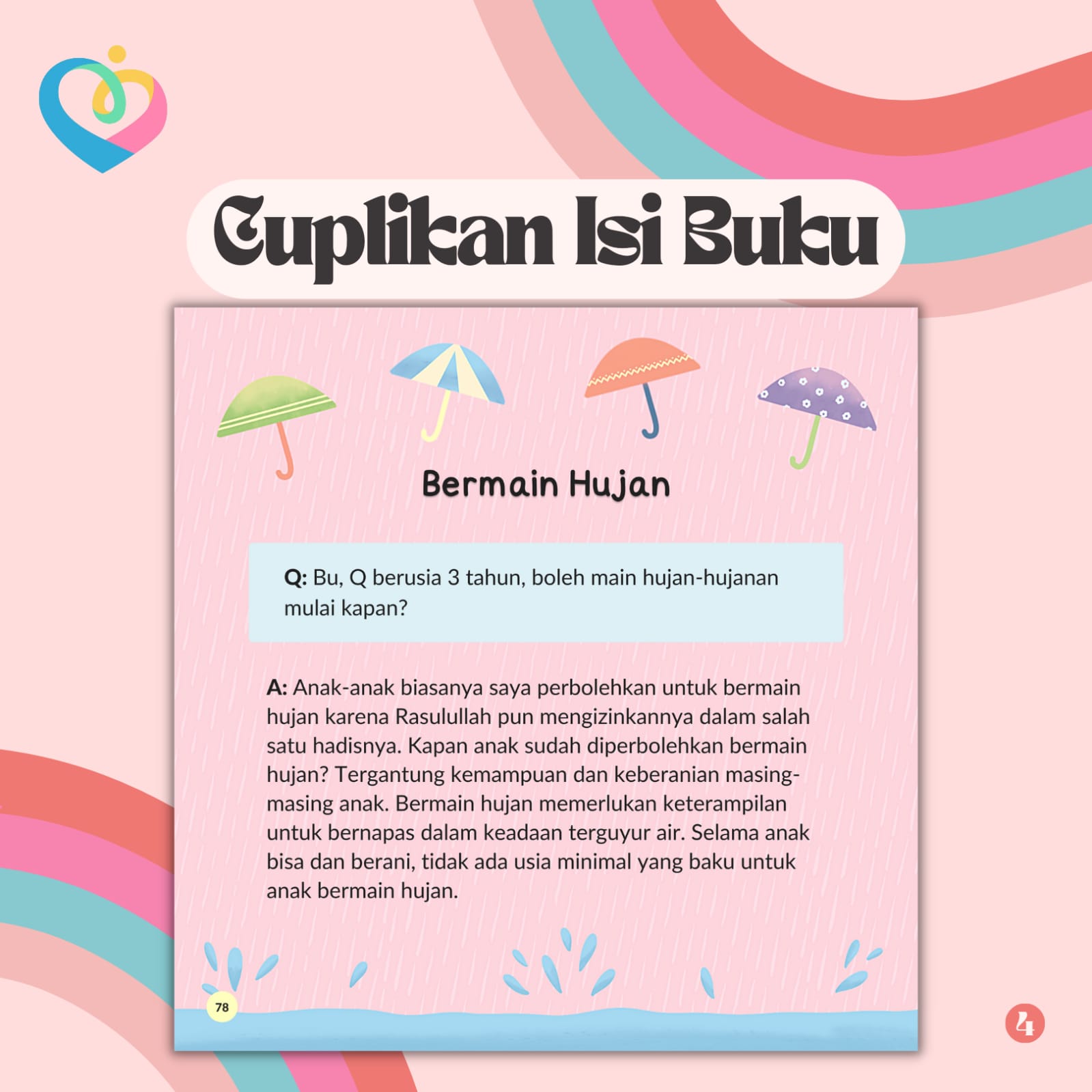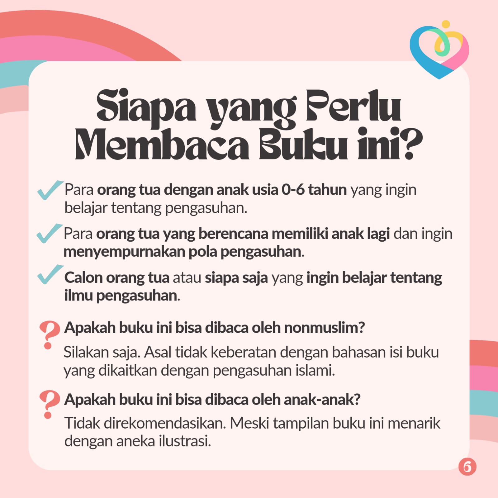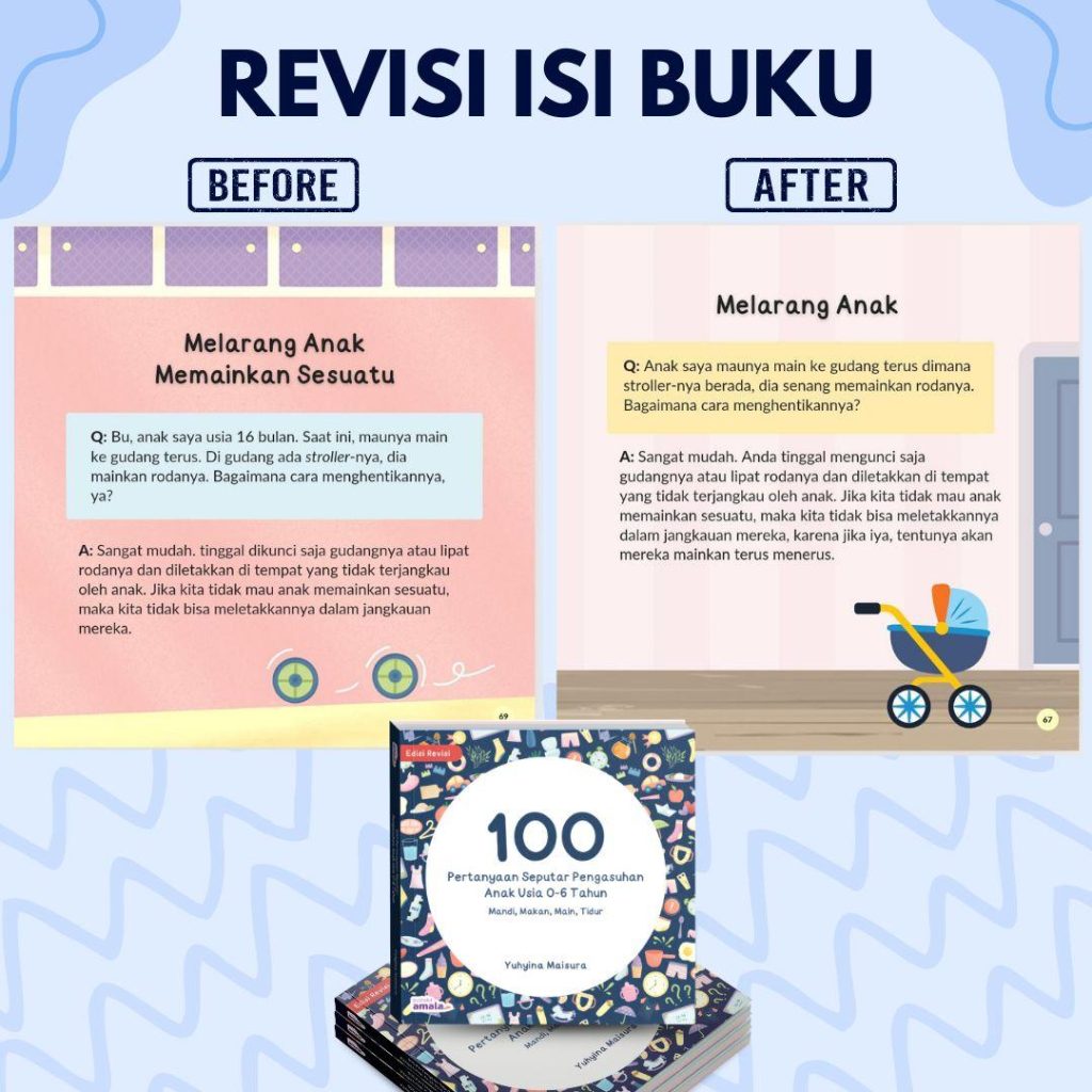 Ratusan pertanyaan yang paling sering ditanyakan tersebut kemudian dikompilasikan dalam buku ini, 100 Pertanyaan Seputar Pengasuhan Anak Usia 0-6 tahun.