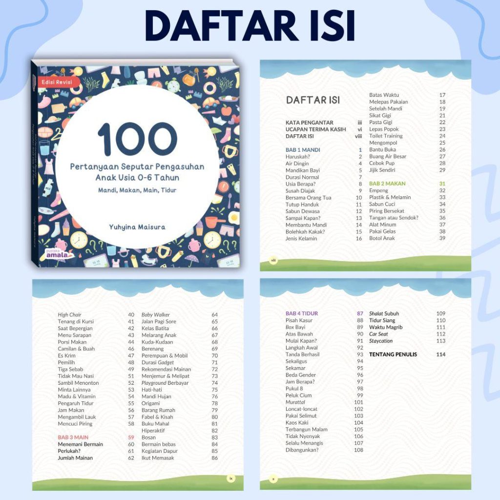 Terdiri dari 4 bab berbeda, masing-masing 25 pertanyaan untuk kemudahan pencarian informasi yang orang tua butuhkan dan mengulas tuntas semua hal yang berhubungan dengan kegiatan fisik anak sehari-hari, mulai dari cara makan, mandi, bermain, dan tidur yang benar.