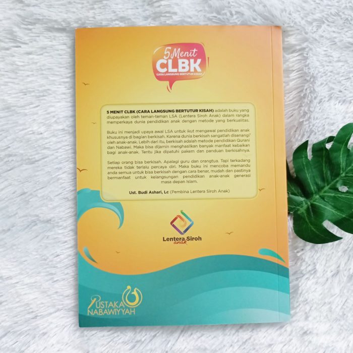 5 MENIT CLBK (CARA LANGSUNG BERTUTUR KISAH) adalah buku yang diupayakan oleh teman-teman LSA (Lentera Siroh Anak) dalam rangka memperkaya dunia pendidikan anak dengan metode yang berkualitas.