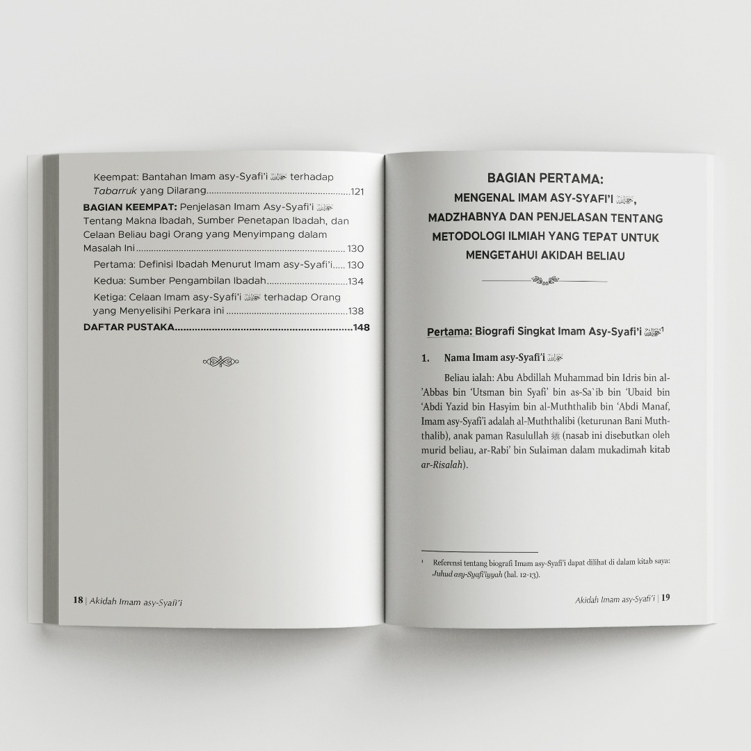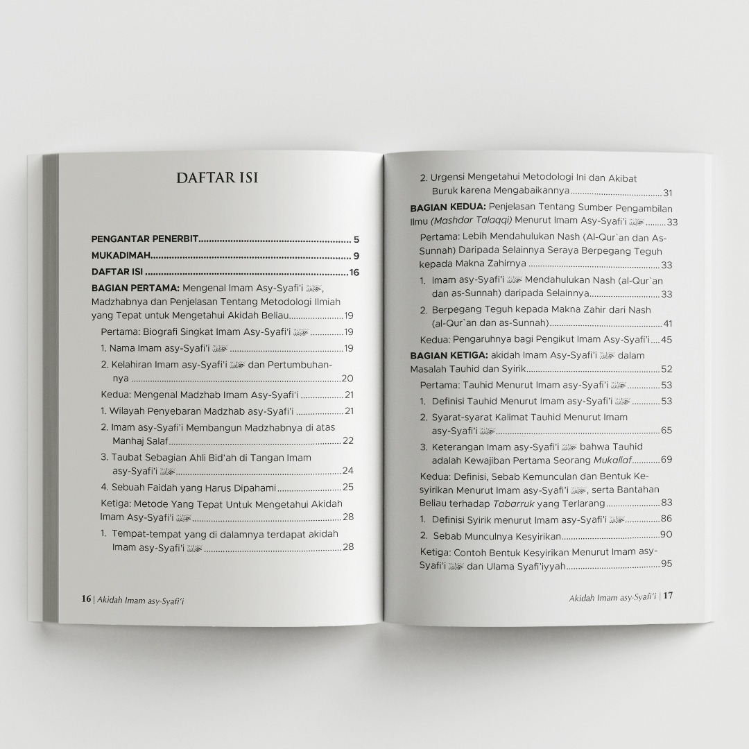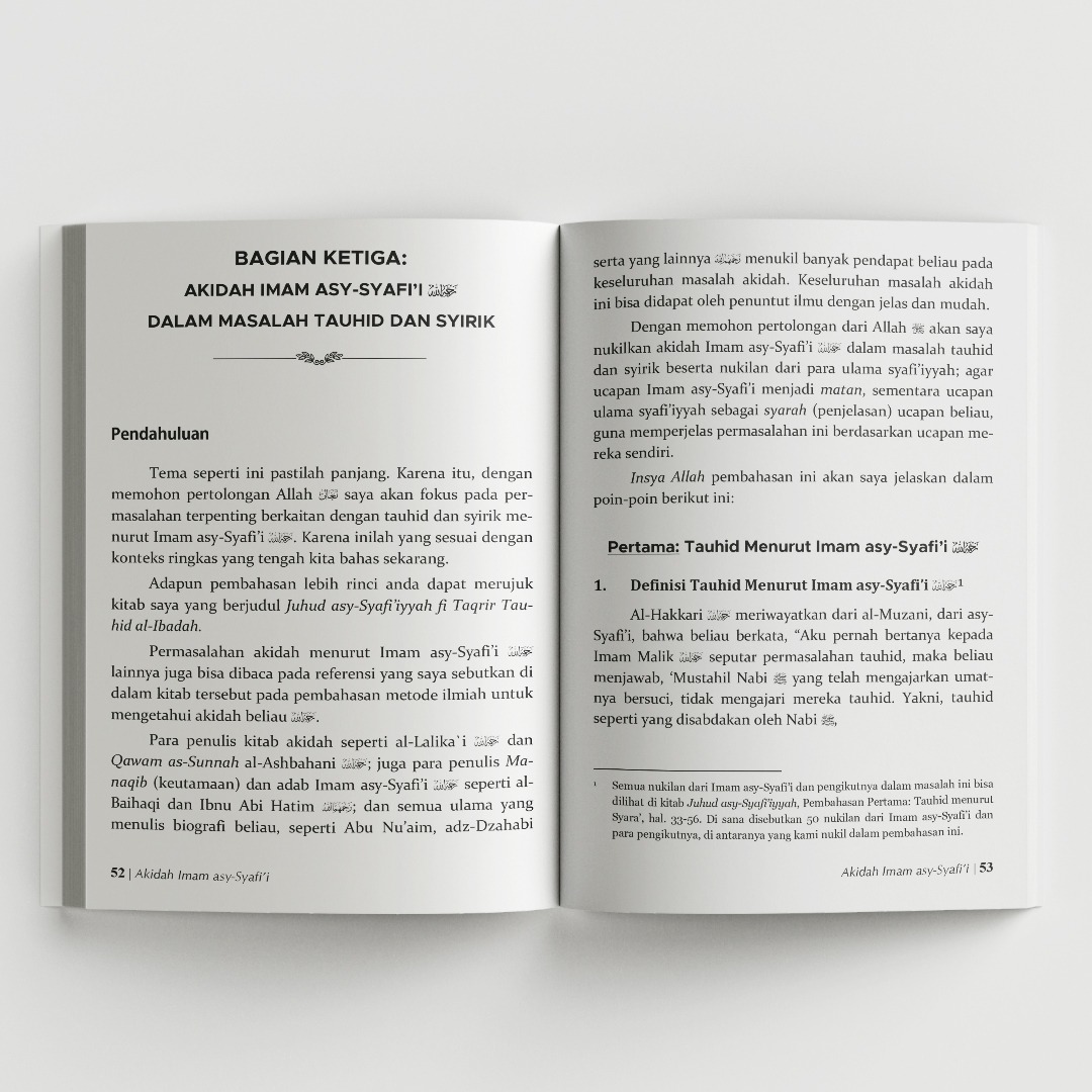 Buku ini dengan gamblang menguraikan pokok-pokok akidah dan tauhid yang dipegang teguh oleh Imam asy-Syafi’i rahimahullah. Penulis meyakinkan dengan membuktikan bahwa Imam asy-Syafi’i rahimahullah adalah imam dalam akidah dan tauhid sebagaimana beliau imam dalam fikih dan ushul fikih.