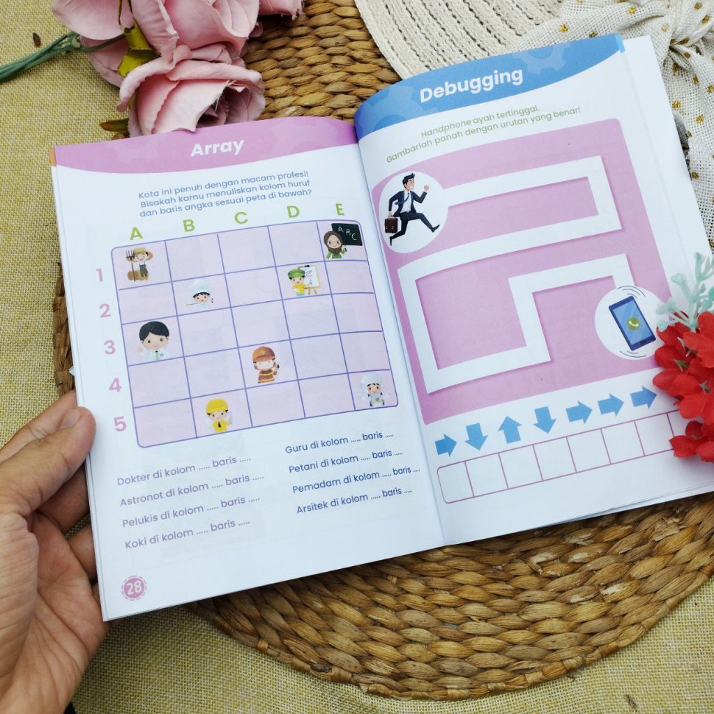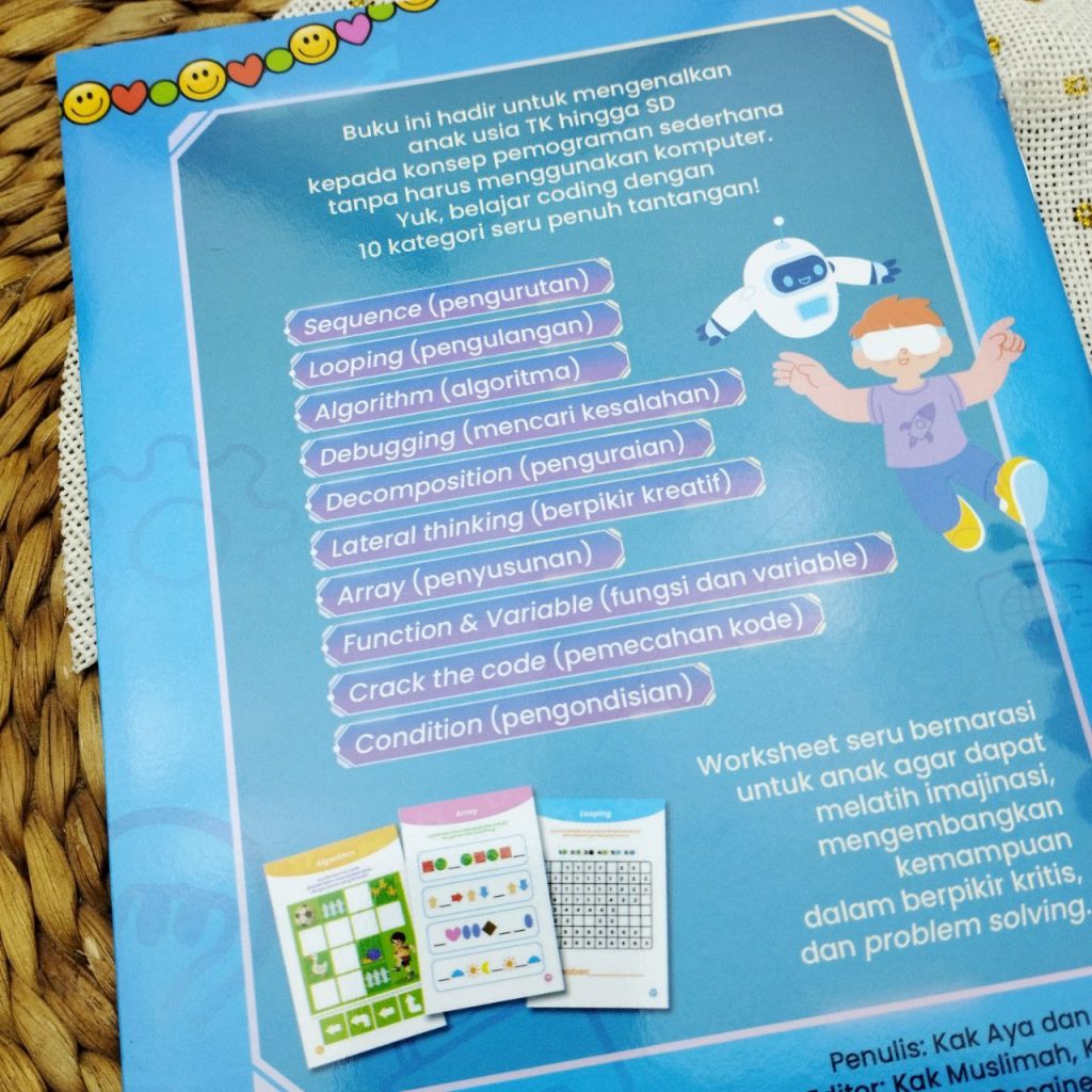 Buku aktivitas seru ini dirancang khusus agar anak-anak bisa belajar berpikir komputasional sambil bermain, tanpa harus berhadapan dengan layar komputer.