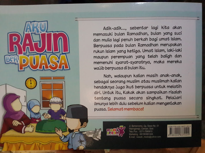 Segala puji bagi Allah Rabb semesta alam. Buku anak ini berbicara tentang puasa, apa saja syarat, rukun, wajib, sunnah dan lain-lain, berikut di antara isinya: