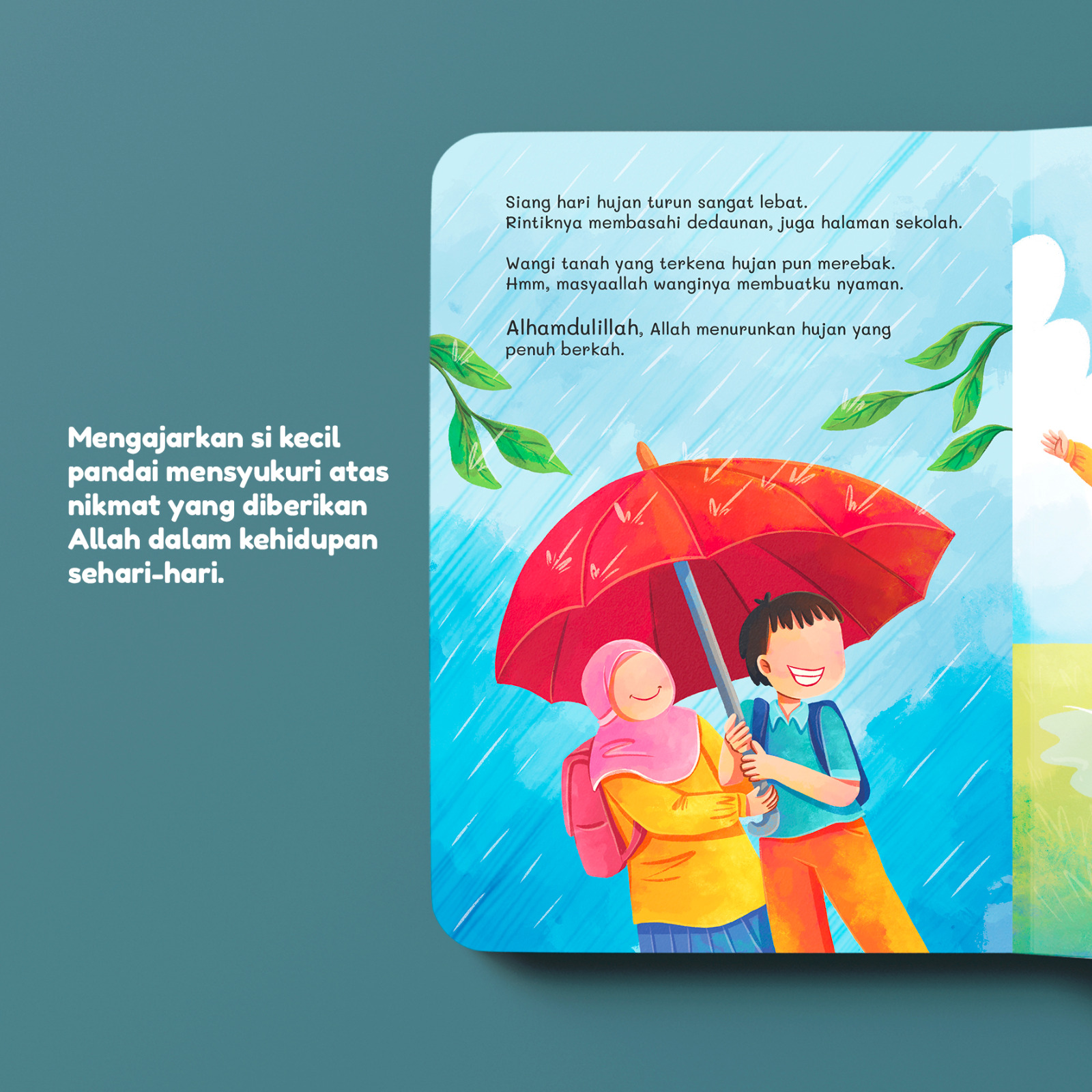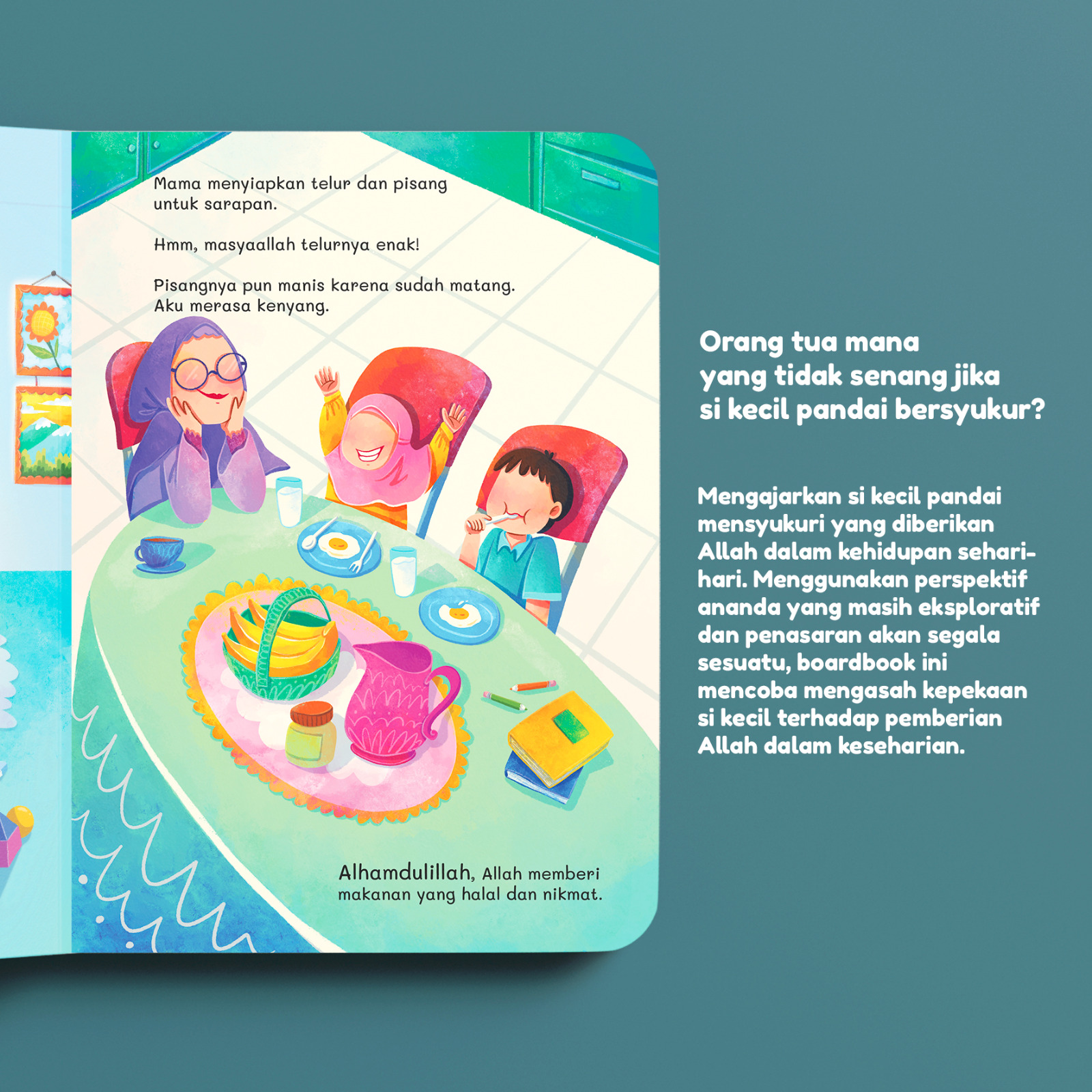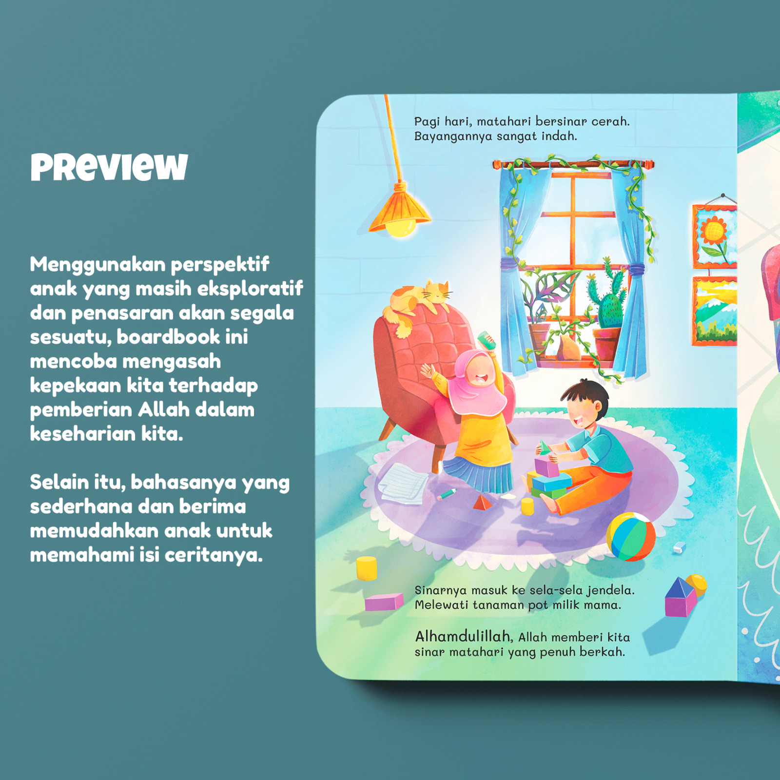 Boardbook kali ini berjudul, “Alhamdulillah Nikmat Allah Banyak Sekali” In syaa Allah, boardbook ini menjadi media tepat Ayah bunda untuk mengajarkan si kecil pandai mensyukuri atas nikmat yang diberikan Allah dalam kehidupan sehari-hari. Menggunakan perspektif ananda yang masih eksploratif dan penasaran akan segala sesuatu, boardbook ini mencoba mengasah kepekaan si kecil terhadap pemberian Allah dalam keseharian kita. Selain itu, bahasanya yang sederhana dan berima memudahkan si kecil untuk memahami isi ceritanya