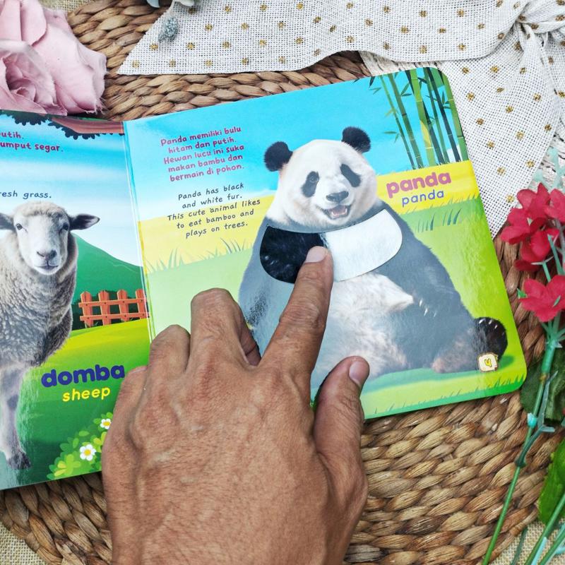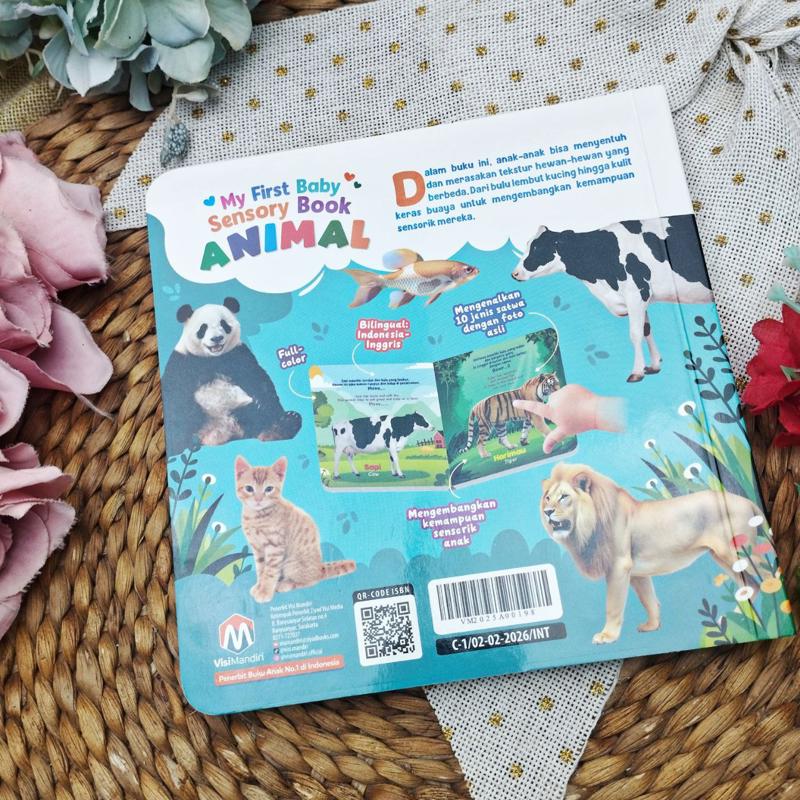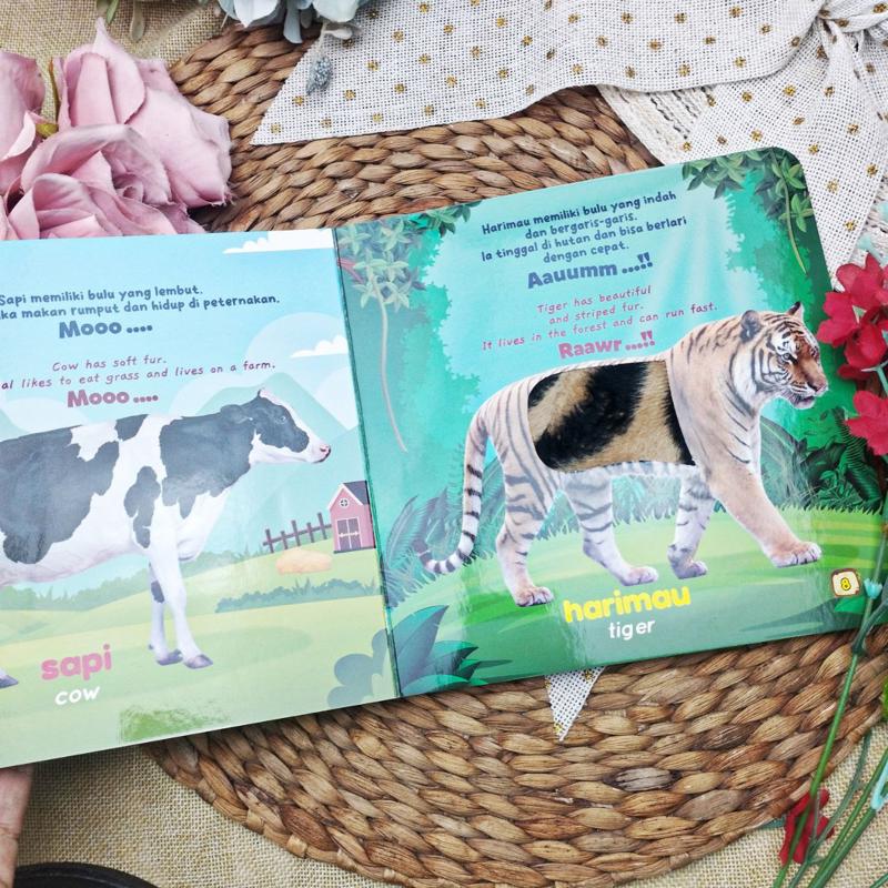 My First Baby Sensory Book: Animal menghadirkan pengalaman belajar interaktif melalui halaman-halaman yang menampilkan berbagai hewan. Setiap halaman memperkenalkan satu hewan dengan fakta unik dalam dua bahasa, disertai ilustrasi yang dibuat realis agar anak lebih mudah mengenali bentuk hewan. Tidak hanya melihat, si kecil juga bisa meraba berbagai tekstur berbeda seperti kulit, bulu, dan sisik yang dirancang khusus untuk merangsang indera peraba.