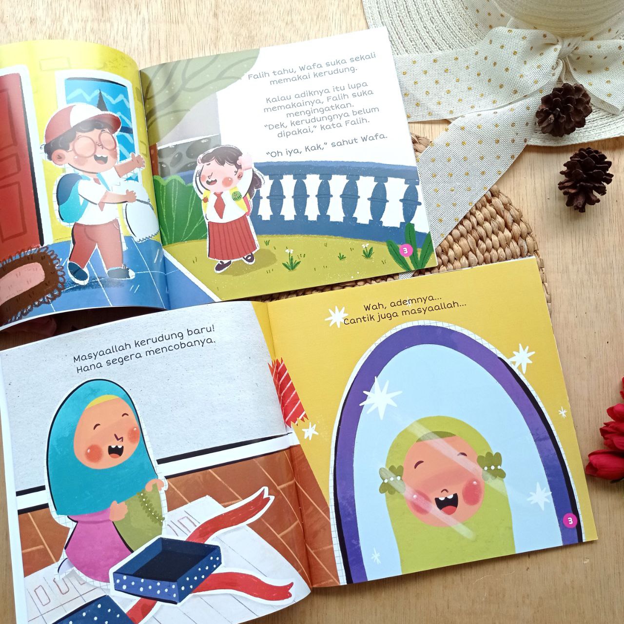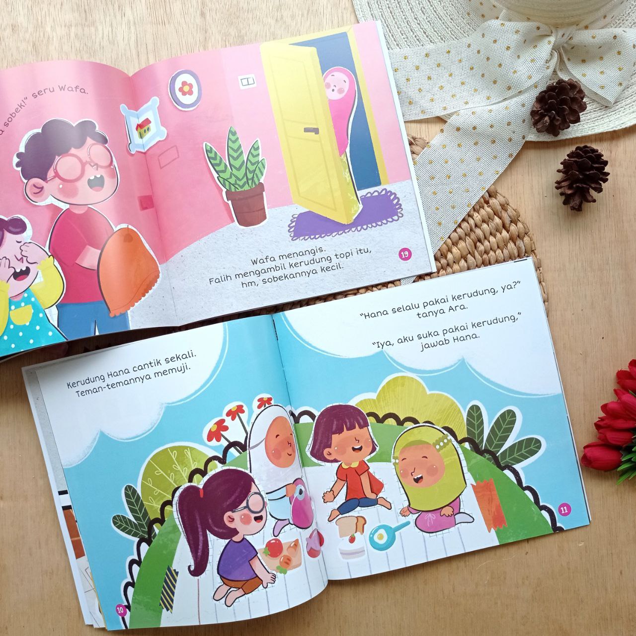 Buku ‘Kerudung Kesayangan Wafa’ dan ‘Kerudung Cantik Hana’ merupakan salah satu buku bacaan edukasi yang mengajarkan si anak untuk semangat dan mau belajar menutup aurat sejak dini.