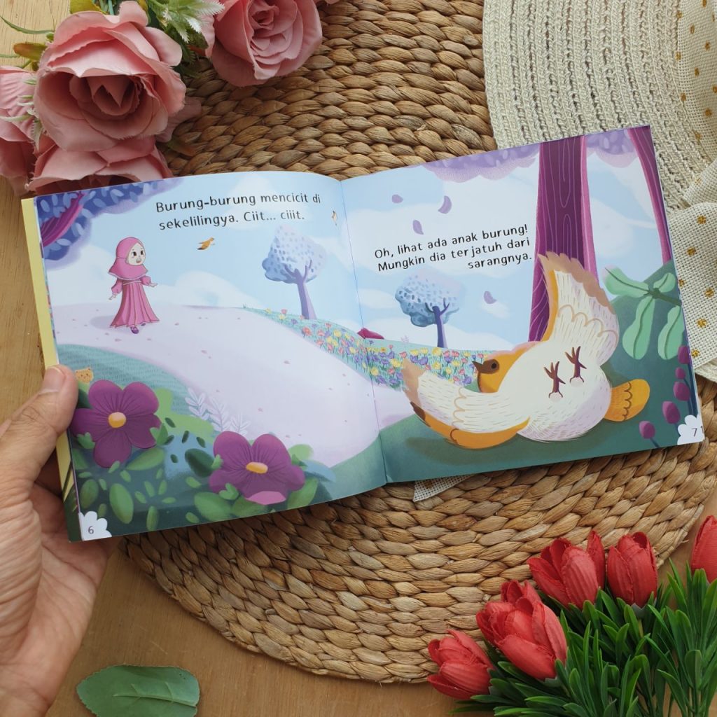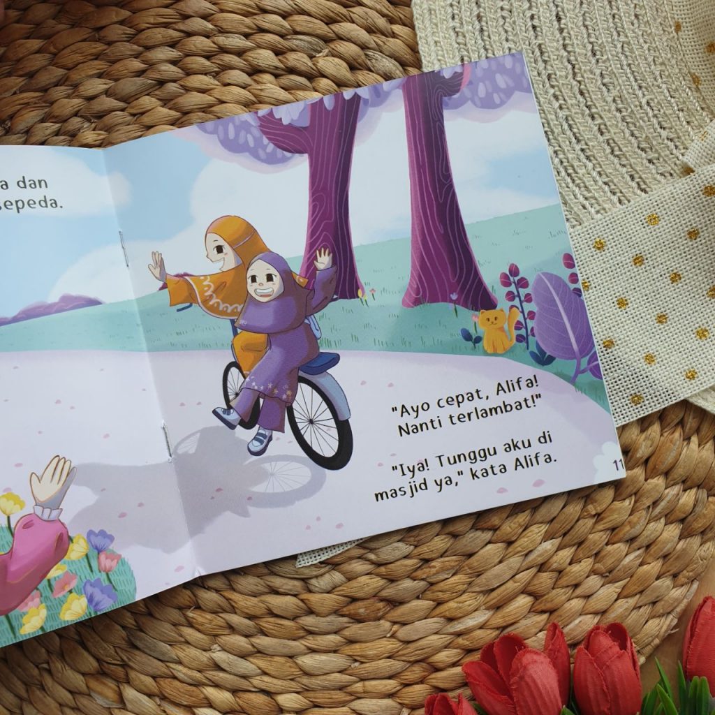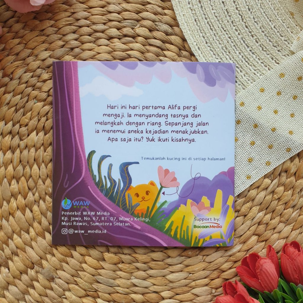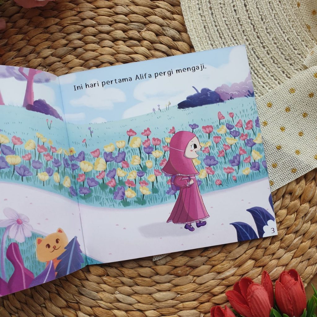 Ini hari pertama Alifa pergi mengaji. Dia merasa sangat gembira. Kegembiraannya itu membuat dia sangat menikmati perjalanannya. Dia memaknai semua yang ia lihat sepanjang jalan. Mulai dari keindahan bunga-bunga, menolong anak burung yang jatuh, sampai mengamati ulat kupu-kupu yang sangat suka makan. Dengan gembira ia mengamati semua ciptaan Tuhan yang terbentang indah di sekelilingnya. Makna yang ia dapat memperbesar kegembiraan hatinya, sehingga ketika ia sampai di masjid, ia menjadi sangat siap belajar.