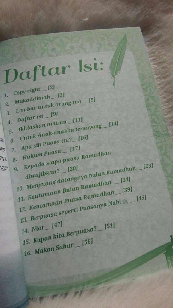 Pada buku ini berisi tentang : pengertian puasa, kapan waktunya, keutamaan bulan ramadhan, keutamaan puasa ramadhan, kepada siapa puasa diwajibkan dan beberapa perkara lain yang berkaitan dengannya, yang kemudian dirangkai dengan puasa-puasa sunnah yang dicontohkan Rasulullah Shalallahu ‘Alaihi wa Salam.