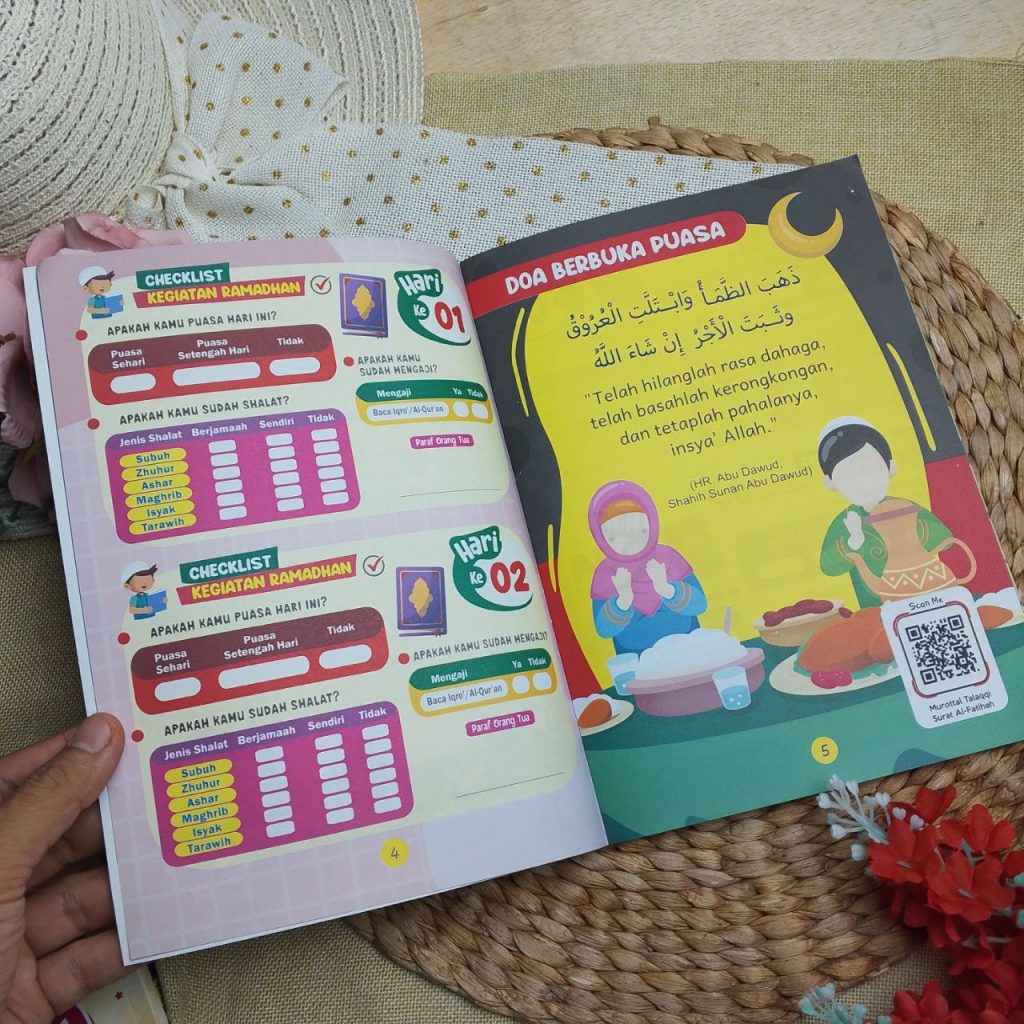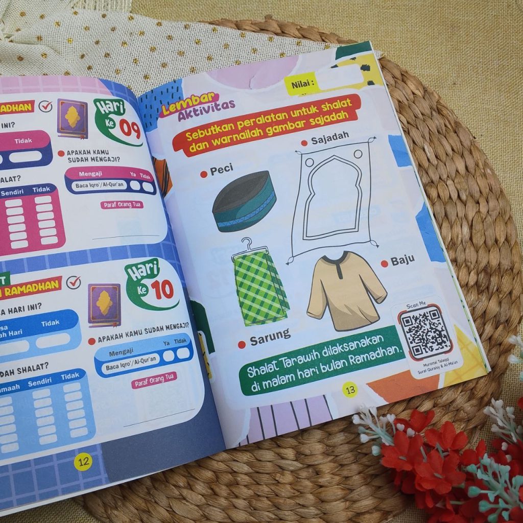 Buku ini dilengkapi dengan checklist kegiatan Ramadhan, halaman aktivitas seperti mewarnai, menebalkan huruf dan angka, serta kosakata harian. Selain itu, terdapat juga audio murattal Talaqqi Juz ‘Amma dan takbiran yang menambah semangat anak dalam belajar dan beribadah.