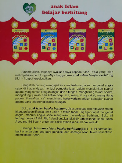 Buku Anak Islam belajar berhitung ini disusun sebagai penyayaan materi hitungan/kognitif pada anak usia 4-6 tahun (anak usia TK) agar dapat mengenal angka, menulis angka serta menguasai dasar-dasar berhitung.
