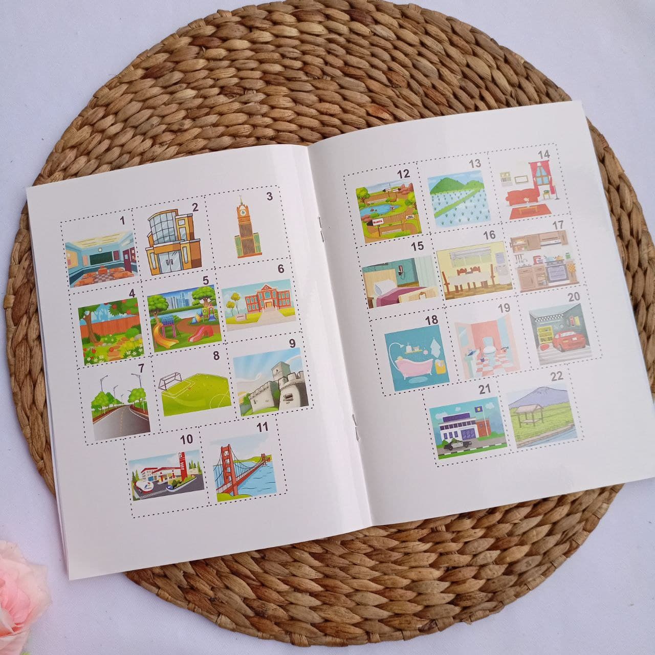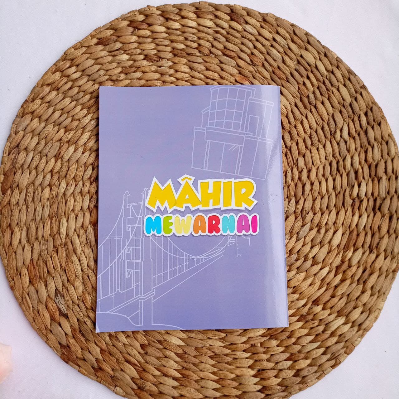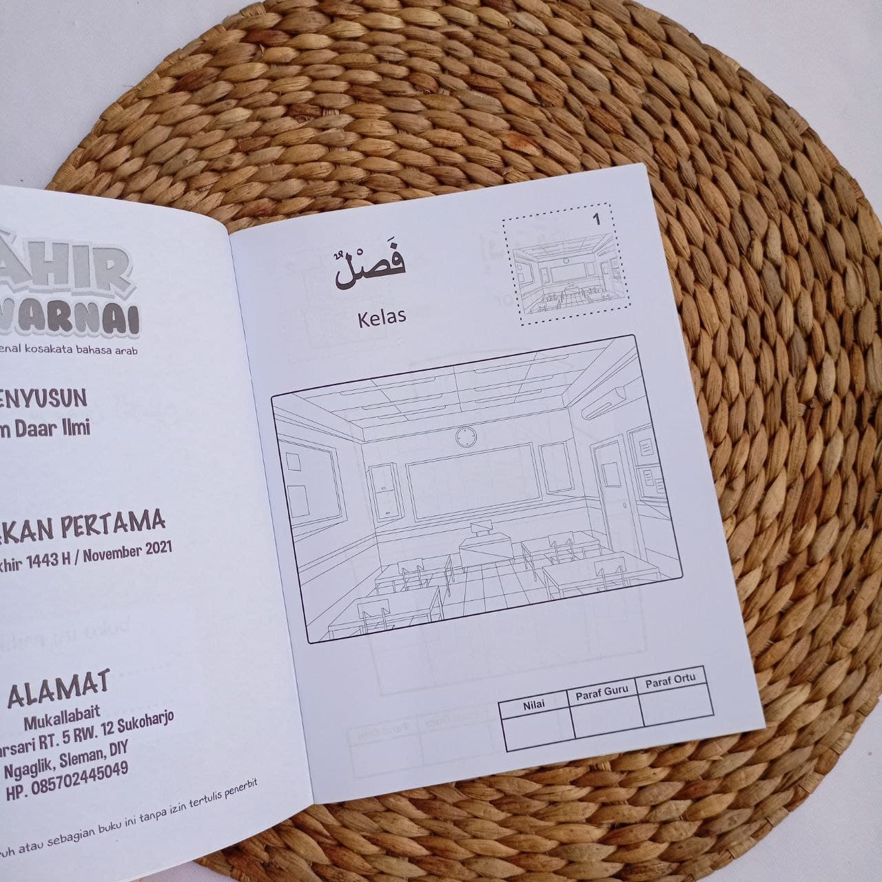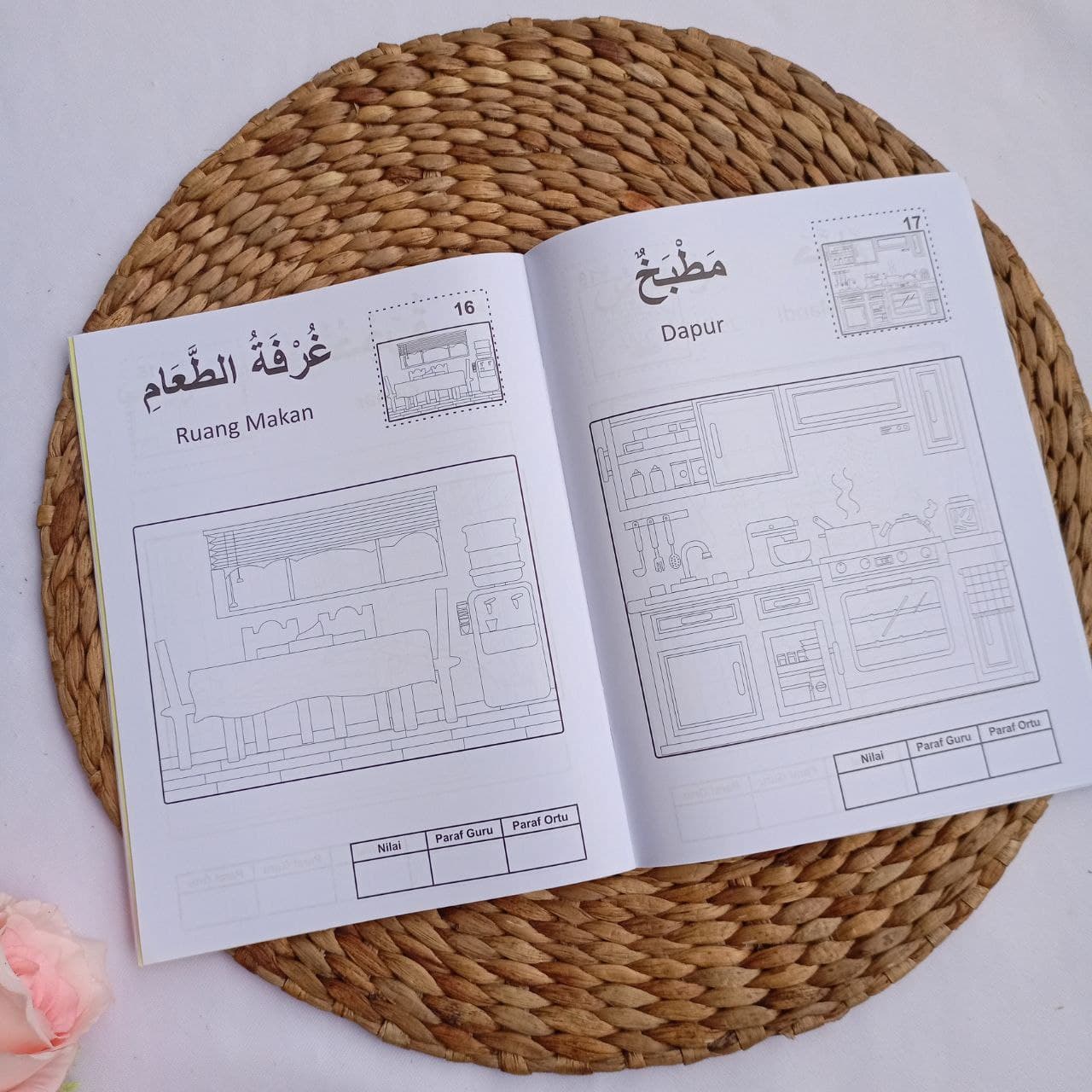 Buku Mahir mewarnai sambil mengenal kosakata bahasa arab tema nama bangunan dan tempat. Disertai sticker menggunting dan menempel bagian yang ke 2.
