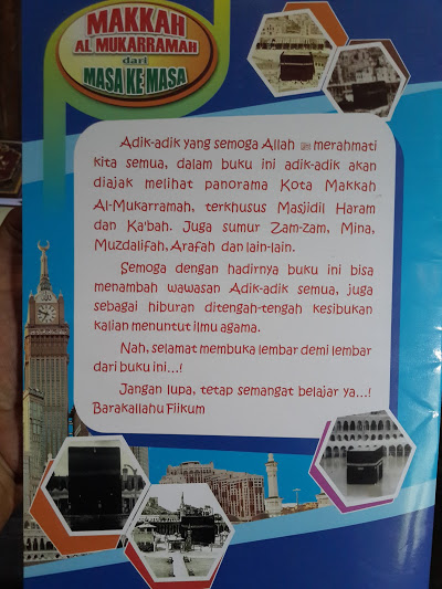 Adik-adik yang semoga Allah merahmati kita semua, dalam buku ini adik-adik akan diajak melihat panorama kota Makkah Al-Mukarramah, terkhusus Masjidil Haram dan Ka’bah. Juga sumur Zam-zam, Mina, Muzdalifah, Arafah dan lain-lain.
