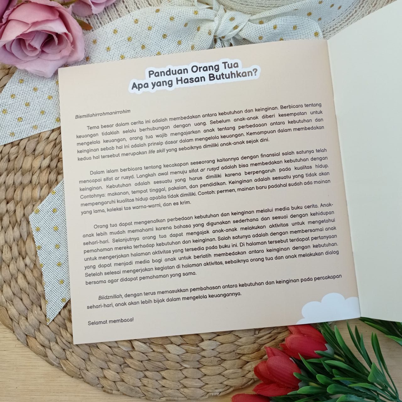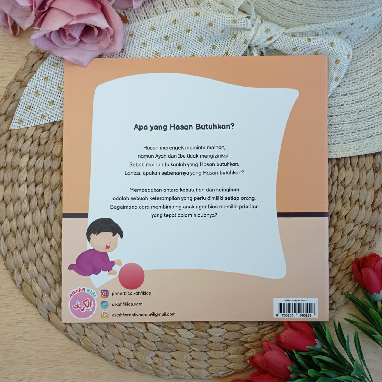 Hasan merengek meminta mainan, namun Ayah dan Ibu tidak mengizinkan. Sebab, mainan bukanlah yang Hasan butuhkan. Lantas, apa sebenarnya yang Hasan butuhkan? Membedakan antara kebutuhan dan keinginan adalah keterampilan penting yang perlu dimiliki setiap orang. Melalui kisah Hasan, anak-anak diajak untuk belajar memilih prioritas yang tepat dalam hidup.