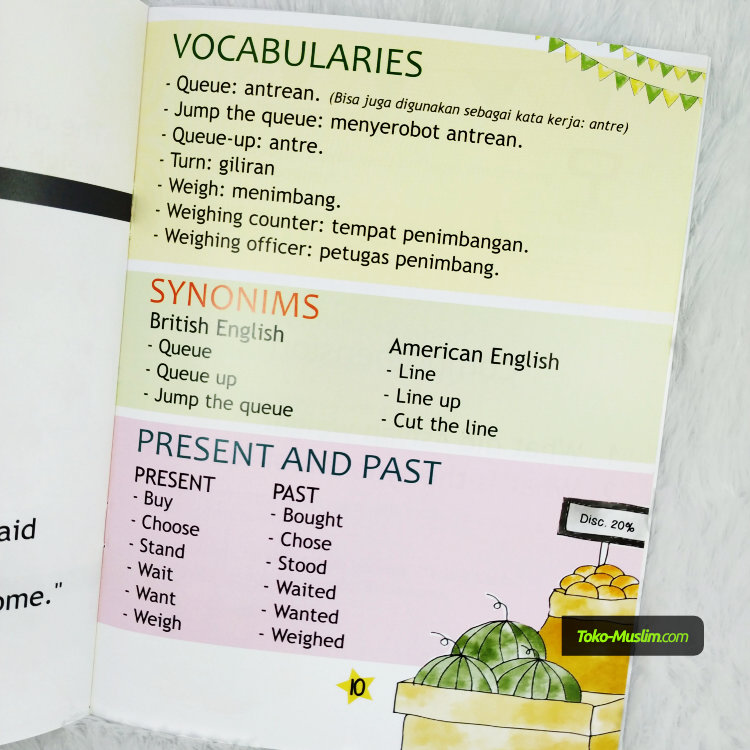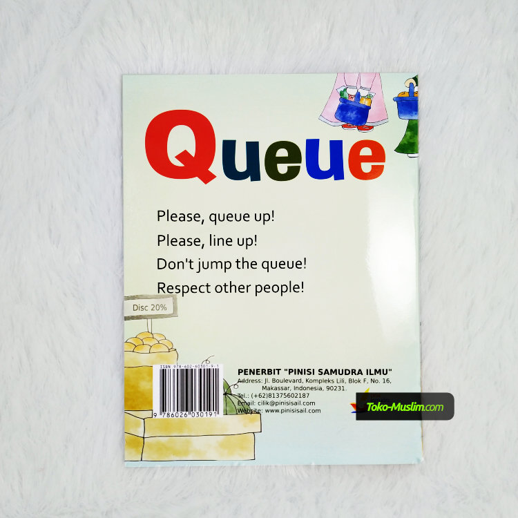 Melalui buku yang kecil ini anak anda akan diajarkan agar memiliki adab yang baik ketika mengantri dimanapun dan kapanpun. Buku ini juga bukan sekedar mengajarkan salah satu adab yang baik tapi sekaligus akan membantu anak anda untuk mempelajari bahasa inggris dengan cara yang menyenangkan.