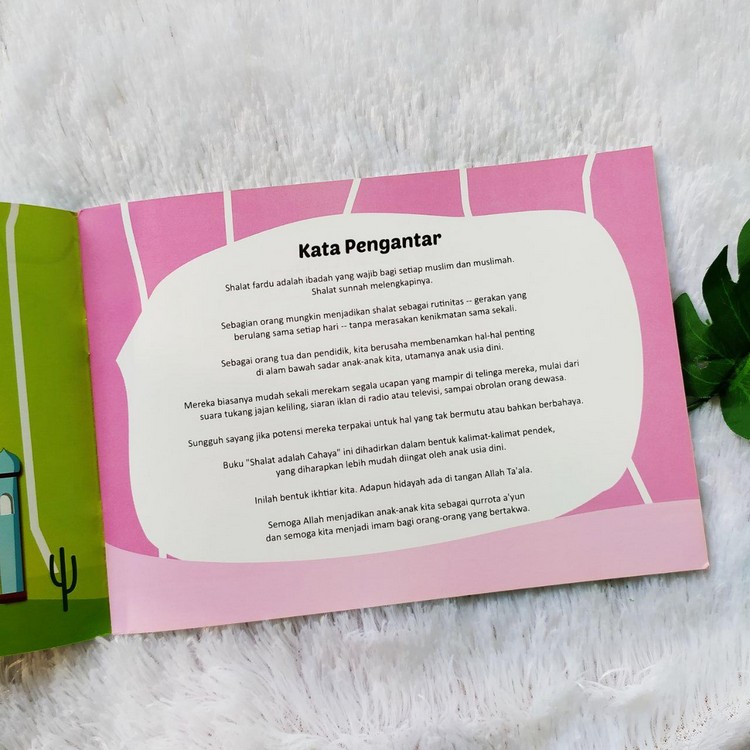 Buku “Shalat adalah Cahaya” ini dihadirkan dalam bentuk kalimat-kalimat pendek, yang diharapkan lebih mudah diingat oleh anak usia dini. Inilah bentuk ikhtiar kita. Adapun hidayah ada di tangan Allah Ta’ala.