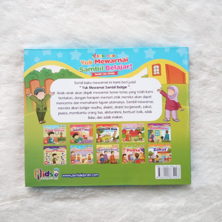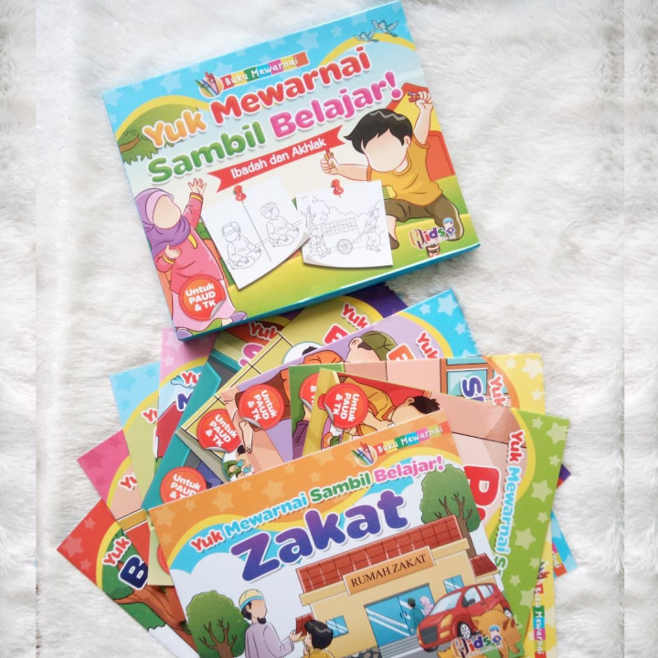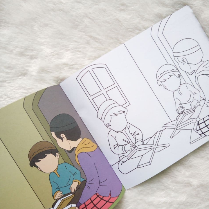 Sambil mewarnai, anak-anak akan belajar tentang wudhu, shalat, shalat berjamaah, zakat, puasa, membantu orang tua, silaturahmi, berbuat baik, adab tidur dan juga adab makan.