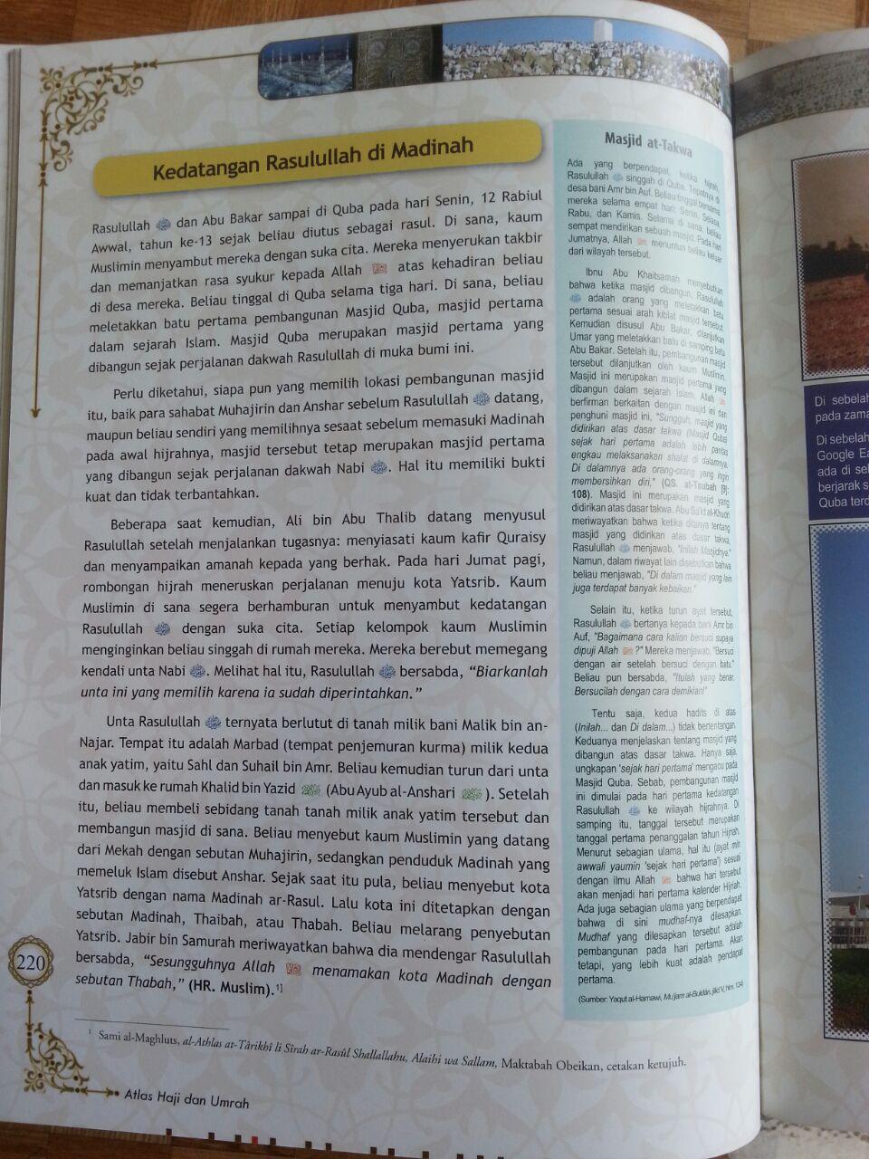 Salah satu referensi terbaik yang kami sarankan untuk Anda yang berniat pergi haji adalah, buku “ATLAS HAJI DAN UMRAH”, karya Sami bin Abdullah al-Maghlouth, imam besar masjid al-Maghlouth, di al-Mabraz, provinsi al-Ahsa, Riyadh, Saudi Arabia. Al-Maghlouth menulis berdasarkan sudut pandang sejarah dan fiqih. Penulis membagi pembahasannya pada dua bagian utama: pertama, aspek sejarah; yang terdiri dari dua sub-pembahasan: sejarah Mekah, dan sejarah Madinah. kedua, aspek fiqih. Pada pembahasan tentang sejarah Mekah, penulis menguraikan cukup rinci tentang Ka’bah. Sejarah pembangunannya dan riwayat perbaikan dan renovasi-renovasi yang dilakukan oleh para khalifah Islam sejak masa Khulafaur Rasyidin sampai masa pemerintahan raja Abdullah sekarang. Tidak sekadar menguraikan, tetapi didukung foto-foto yang jarang bisa ditemukan di tempat lain. Penulis juga melakukan napak tilas tentang rute perjalanan haji zaman dulu. Saat teknologi transportasi belum secanggih sekarang. Penulis menyambangi tempat-tempat persinggahan para kafilah haji zaman dulu yang terdapat sumur-sumur air dan tempat peristirahatan mereka. Salah satu yang sangat menarik adalah, foto tempat peristirahatan kafilah haji yang berada di Tashkent, Uzbekistan. Pada masanya, tempat ini tentu sangat penting bagi para jemaah haji, khususnya yang berasal dari beberapa tempat di Asia, yang menempuh jalur darat untuk sampai ke tanah suci. Namun saat ini, tempat tersebut tinggal puing-puing bangunan tua yang sudah hampir musnah terkubur dalam tanah. Penulis juga menguraikan tentang perhatian yang besar dari para khalifah Islam terhadap pelayanan dan keselamatan para jemaah haji, hingga di titik-titik tertentu disediakan benteng dan pos jaga, dan pada setiap rombongan haji terutama yang melalui jalur darat selalu dikawal oleh sejumlah tentara yang bertanggung jawab menjaga keamanan mereka dari gangguan para perampok. Perhatian yang besar itu terus berlanjut hingga masa raja Arab Saudi yang sekarang, Raja Abdullah. Selain uraian tentang sejarah Mekah, uraian tentang sejarah Madinah pun tidak kalah menarik. Apakah Anda pernah melihat bagaimana bentuk masjid Nabawi pada masa Nabi Muhammad? Di buku ini, tepatnya di halaman 223 Anda akan menemukan sebuah foto ilustratif tentang bentuk Masjid Nabawi pada masa Rasulullah saw. Apakah bentuk memang benar-benar akurat seperti bentuk Masjid Nabawi pada masa Nabi? Yang jelas, gambar ini berasal dari Pusat Penelitian dan kajian Madinah al-Munawwarah, mereka tentu membuatnya berdasarkan penelitian dan penelaahan terhadap hadis-hadis yang shahih, sehingga terbentuklah ilustrasi gambar Masjid Nabawi tersebut. Bagaimana Meraih Haji Mabrur? Bagi orang-orang yang beriman, pengetahuan tentang sejarah dua kota suci ini beserta liku-likunya, akan mampu meningkatkan keimanan dan mendorong hadirnya letupan-letupan emosi spiritual yang kental ketika melihat tempat-tempat tersebut secara nyata dengan mata sendiri. Hal demikian bisa meningkatkan kekhusyukan dalam proses pelaksanaan ibadah haji dan umrah. Namun aspek fiqih tidak boleh diabaikan. Ibadah haji, sama seperti ibadah-ibadah ritual lainnya, memiliki syarat dan rukun yang wajib, sunnah, mubah untuk dilakukan, selain juga terdapat hal-hal yang tidak boleh dilakukan. Pada pembahasan tentang aspek fiqih pelaksanaan ibadah haji dan umrah, penulis menguraikan sangat lengkap dengan cara yang sangat sederhana dan mudah dipahami, dilengkapi ilustrasi penunjang yang tentu saja lebih memperjelas uraian tersebut. Seperti bentuk pakaian yang boleh dipakai serta cara mengenakannya, peralatan apa saja yang boleh dibawa dan yang tidak boleh dibawa. Yang tidak kalah menarik adalah rute dan peta, serta miqat-miqat tempat dimulainya ibadah haji dan umrah dijelaskan dalam bentuk peta yang atraktif. Semua tahapan pelaksanaan ibadah haji umrah diuraikan secara beruntun sesuai urutan-urutannya, berdasarkan al-Qur’an dan sunnah yang shahih. Informasi Termutakhir Perkembangan Kota Mekah dan Madinah Memahami prosesi pelaksanaan ibadah haji dan umrah, kurang memadai jika tidak dilengkapi dengan informasi termutakhir perkembangan kota Mekah dan Madinah, karena hal ini terkait erat dengan efisiensi waktu dan efektifitas pelaksanaan kedua ritual ibadah itu. Penulis buku ini pun menyertakan informasi terbaru, seperti bentuk baru jumrah. Jika sebelumnya, jumrah berbentuk semacam monumen batu tegak, bentuk terbarunya pun diuraikan dalam buku ini disertai foto dan tata cara pelemparannya. Oleh karena kemacetan menjadi masalah klasik yang tidak pernah teratasi, terutama pada musim haji, penulis juga menguraikan beberapa kiat agar bisa melaksanakan beberapa rukun haji tanpa terjebak macet, dengan tidak mengorbankan syarat dan rukunnya. Sebagai orang asli, penulis tentu sangat mengenali seluk beluk kota Mekah dan Madinah. Mekah akan menjadi pusat bumi? Informasi ini pun tidak luput dari ulasan penulis. Berdasarkan fakta geografis dan penelitian para ahli, pemerintah Arab Saudi memiliki data yang cukup kuat untuk menjadikan Mekah sebagai pusat dunia. Apa yang bisa kami uraikan dalam tulisan ini hanya sedikit dari semua muatan isi buku ini. Kami pantas merekomendasikan buku ini kepada Anda yang akan berangkat haji atau umrah, sebagai bekal untuk meraih haji dan umrah yang mabrur. Rasulullah saw. bersabda, “Satu umrah ke umrah berikutnya menjadi pelebur dosa yang terjadi di antara keduanya. Tidak ada balasan bagi haji mabrur kecuali surga,” (Muttafaq ‘alaih)