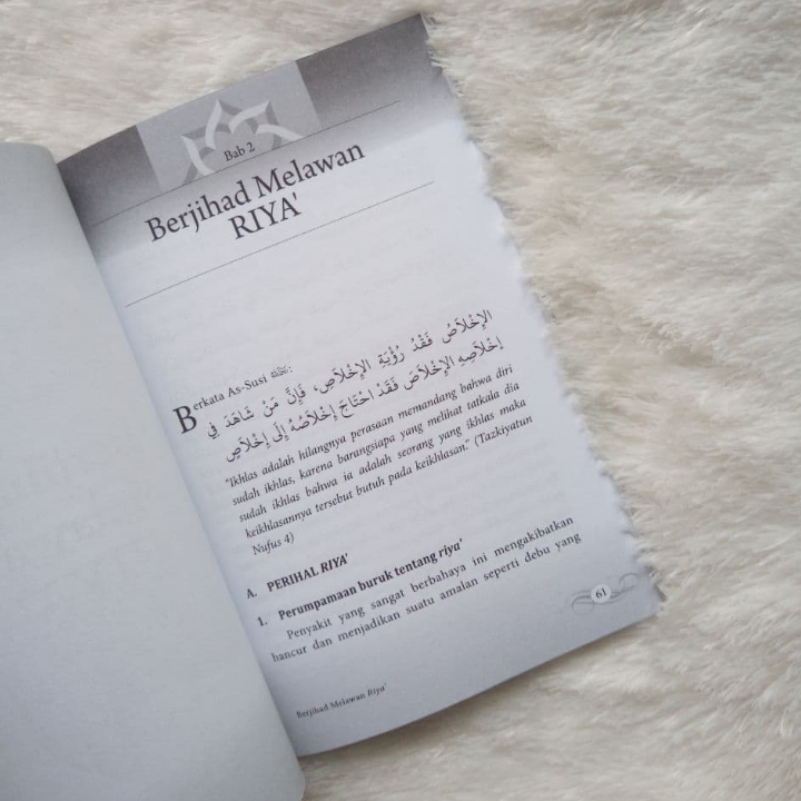 Buku “Berjihad Melawan Riya Dan Ujub” ini membahas mengenai masalah hati, diharapkan dengan melalui buku ini, para pembaca akan terbantu untuk mengontrol hati dari penyakit-penyakit yang dapat merubah niat dari suatu amal ibadah. Saudara pembaca juga akan menemukan berbagai tips dan kisah nyata dari para pendahulu kita yang shalih, bagaimana cara agar terhindar dari penyakit hati sehingga hati akan aman dari hal-hal yang buruk dan keihklasan pun bisa didapatkan.