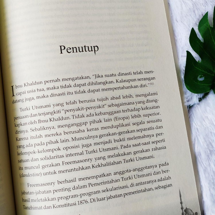 Buku yang ada di tangan pembaca ini, memotret detik-detik runtuhnya Turki Utsmani. Namun, tidak sekadar menampilkan faktor-faktor penyebab keruntuhannya yang telah banyak dikupas dalam tulisan-tulisan lain. Lebih dail itu, buku ini menghadirkan fakta-fakta yang menyingkap peran gerakan rahasia dalam upaya penghancuran Turki Utsmani. Bagi siapa pun yang memiliki perhatian terhadap sejarah Islam, gerakan clandestine dan konspirasi; maka buku ini layak untuk menjadi teman Anda.