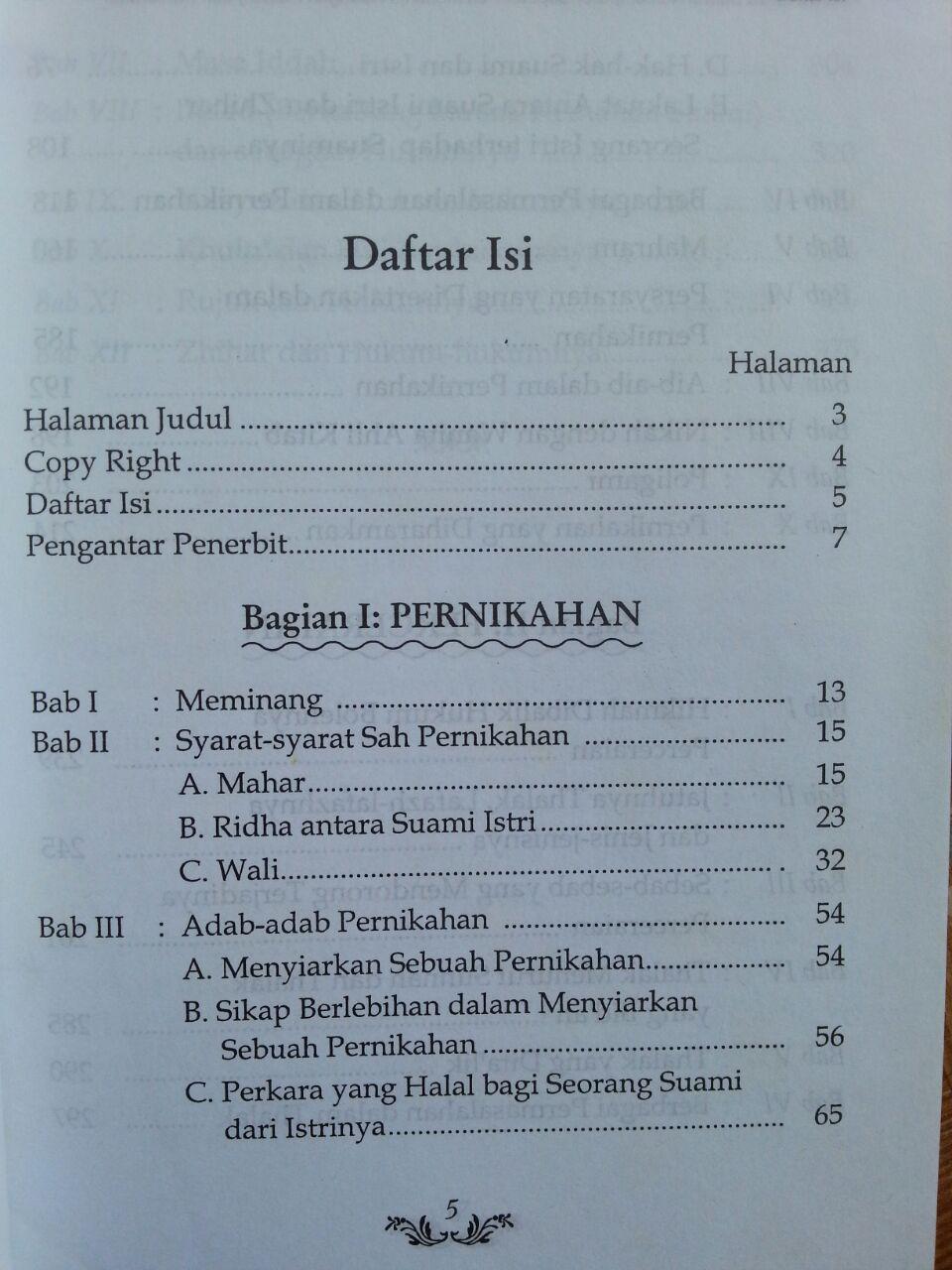 Buku ini mencoba merangkum berbagai problema yang berkaitan dengan kehidupan berumah tangga, mulai dari masalah seputar pernikahan (meminang, syarat dan adab pernikahan, aib-aib dalam pernikahan, menikahi ahlul kitab, poligami), hubungan pasutri, hak dan kewajiban suami istri, masalah zhihar, khulu’, thalak, masa ‘iddah, nusyuz, ihdad (berkabung), ruju, dsb, untuk kemudian dicarikan jalan keluarnya sesuai dengan aturan syariat.