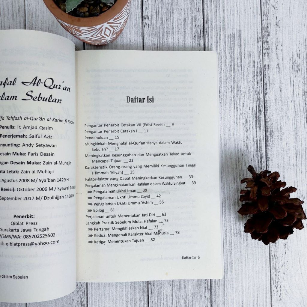 Apakah Anda sudah menyerah untuk menjadi seorang hafizh atau penghafal Al-Qur’an? Apakah Anda sudah menerapkan berbagai metode dan tips agar dapat menghafal Al-Qur’an, akan tetapi Anda tidak juga berhasil? Padahal, apabila Anda hafal Al-Qur’an, Anda akan mendapatkan kedudukan yang tinggi di sisi Allah, mahkota kehormatan akan disematkan di atas kepala Anda, Anda akan mendapatkan nikmat seperti nikmat yang dimiliki para nabi, dan mendapatkan berbagai keutamaan lainnya. Melalui buku ini, Ir. Amjad Qosim coba menawarkan metode menghafal Al-Qur’an dalam waktu yang singkat. Tidak tanggung-tanggung, hanya dalam waktu sebulan, Anda dapat menghafalnya secara keseluruhan, jika Anda mau menerapkan metode yang ia tawarkan. Bukan cuma para santri dan mereka yang masih muda belia, yang dapat menerapkan metode ini, siapapun bisa. Karena di dalam satu bab, penulis memaparkan tiga pengalaman yang kesemuanya adaiah ibu rumah tangga, yang memiliki tugas dan kewajiban untuk mengurus rumah tangga dan mendidik anak. Dengan semangat yang tinggi dan diiringi doa, akhirnya merekapun dapat menghafal Al-Qur’an dalam waktu yang singkat Karena begitu menarik dan pentingnya buku ini, maka kami berusaha menghadirkannya ke hadapan Anda. Semoga dengan hadirnya buku ini, kita akan terpacu lebih giat lagi untuk menghafal Al-Qur’an. Selamat mengambil manfaat dari buku ini.