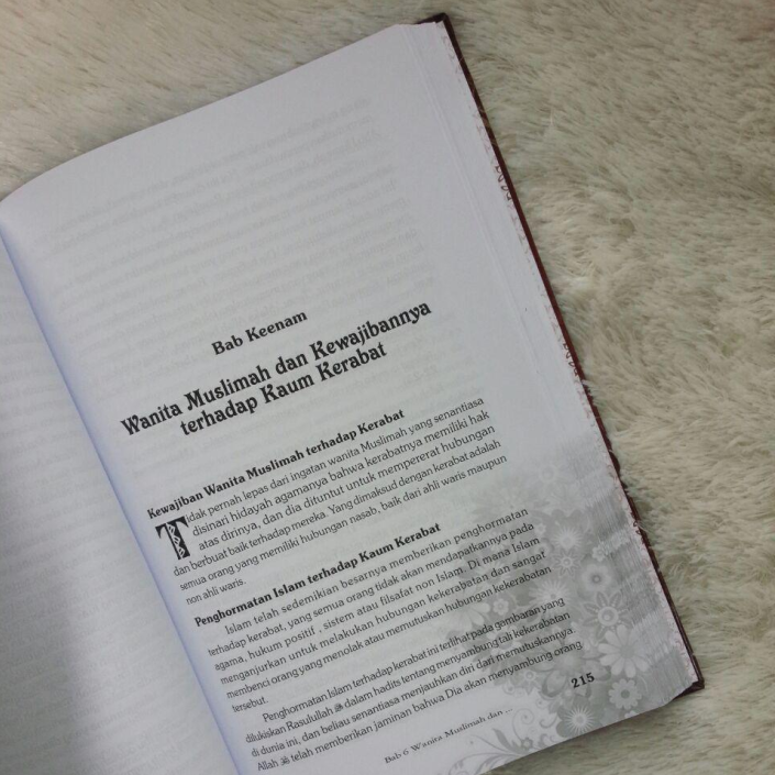Buku ini menyajikan gambaran jati diri dan kepribadian wanita muslimah yang utuh seperti : wanita muslimah bersama orang tuanya, wanita muslimah bersama suaminya, wanita muslimah bersama tetangganya, wanita muslimah bersama kerabat dan sanak-saudaranya, wanita muslimah bersama saudara dan rekan-rekannya dan wanita muslimah bersama masyarakat yang semua ini akan memberikan nilai lebih dan derajat yang tinggi di mata masyarakat serta pahala yang besar di akhirat.