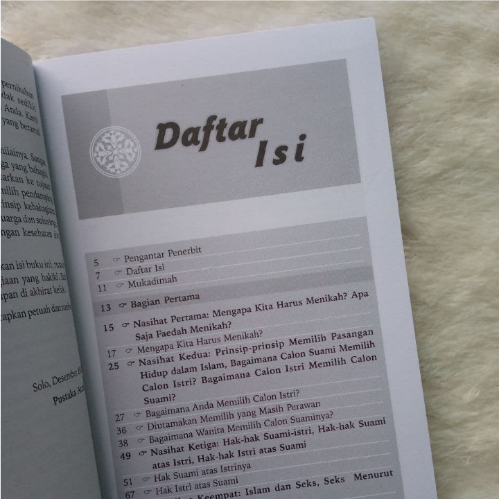 Pembahasan dalam buku ini mengupas banyak hal tentang pernikahan. Dimulai dengan mengapa kita harus menikah, apa manfaat pernikahan, Bagaimana memilih calon istri atau suami, dan segala hal yang berkaitan dengan permasalahan-permasalahan sebelum pernikahan.