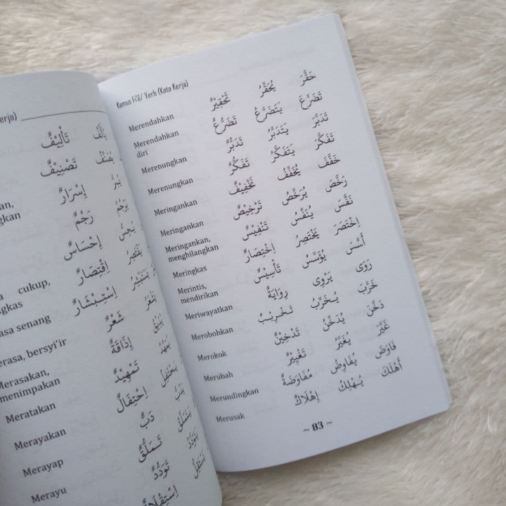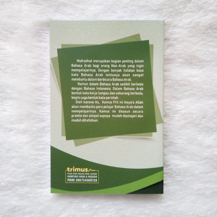 Buku ini “Buku Kamus Fi’il Kata Kerja Arab Indonesia” , Kamus ini dibuat agar para pelajar bahasa Arab lebih mudah mencari fi’il tanpa membuka kamus besar bahasa Arab. Dirancang agar mudah dibawa kemana-mana dan udah untuk dihafalkan.