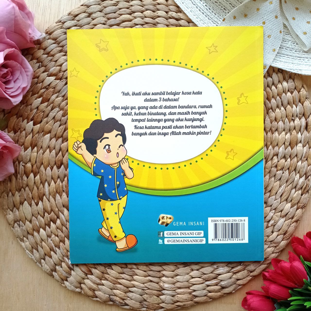 Yuk, ikuti aku sambil belajar kosa kata dalam 3 bahasa! Apa saja ya, yang ada di dalam bandara, rumah sakit, kebun binatang, dan masih banyak tempat lainnya yang aku kunjungi. Kosa katamu pasti akan bertambah banyak dan insyaallah makin pintar!