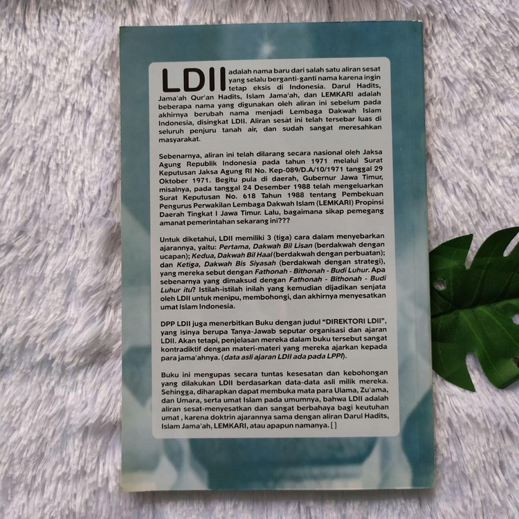 Buku ini mengupas secara tuntas kesesatan dan kebohongan yang dilakukan LDII berdasarkan data-data asli milik mereka. Sehingga, diharapkan dapat membuka mata para Ulama, Zu’ama, dan Umara, serta umat Islam pada umumnya, bahwa LDII adalah aliran sesat-menyesatkan dan sangat berbahaya bagi keutuhan umat , karena doktrin ajarannya sama dengan aliran Darul Hadits, Islam Jama’ah, LEMKARI, atau apapun namanya.