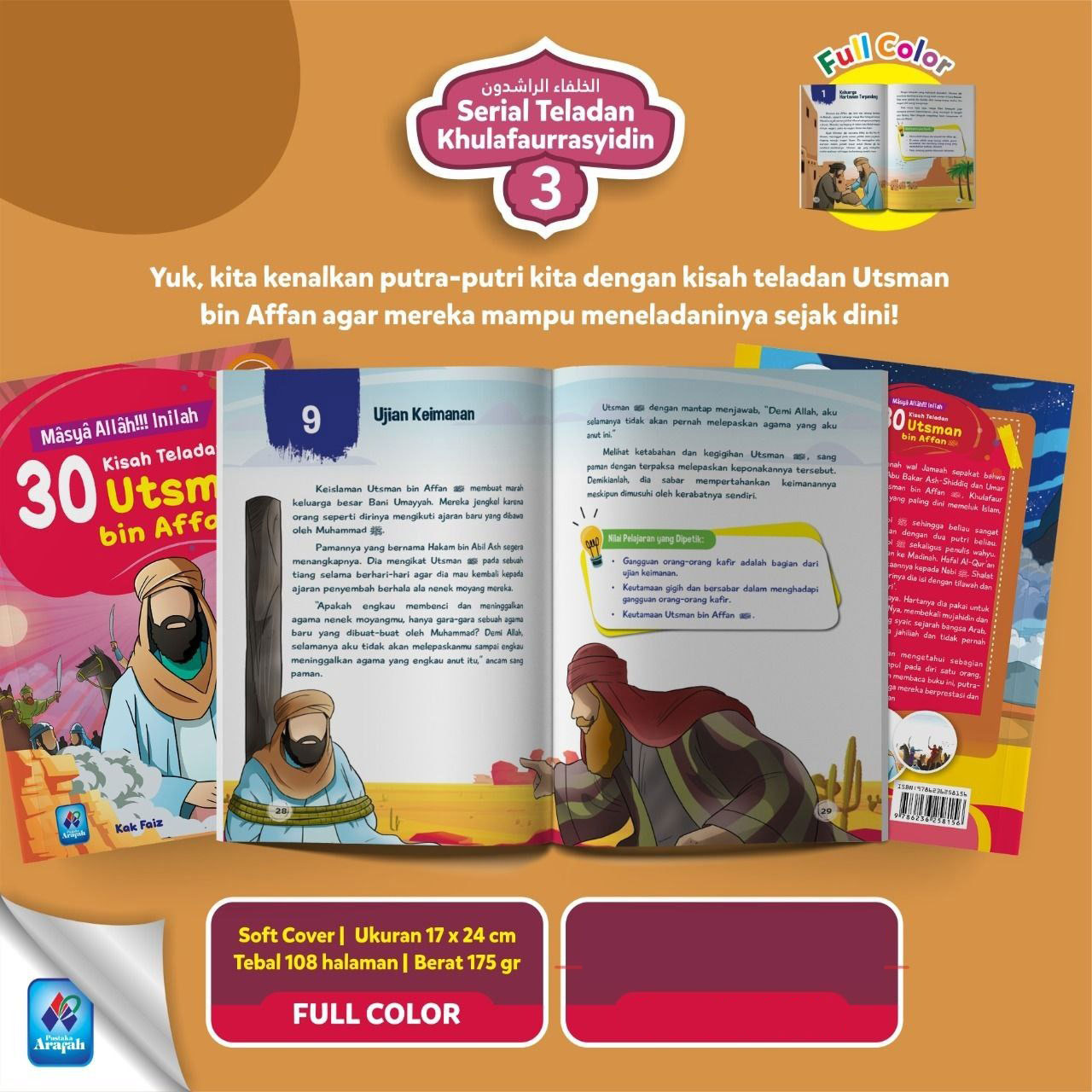 Selain kisah inspiratif dari Utsman bin Affan, terdapat pula nilai pelajaran yang bisa dipetik dari kisah tersebut agar si kecil mampu meneladaninya sejak dini. Penasaran seperti apa bukunya? Yuk, miliki sekarang juga!