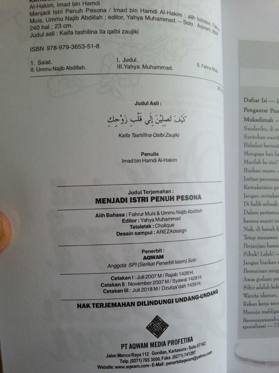 Buku ini berjudul “Buku Menjadi Istri Penuh Pesona” , Buku ini menguraikan sifat dan karakter istri idaman suami. Tak lupa, disertai berbagai tips dalam kiat memikat hati suami yang dilengkapi dengan hikayat, kisah, dan perkataan para ulama. Tak berlebihan kiranya, jika setelah membaca buku ini Anda akan mengatakan, “Suamiku adalah surgaku!”