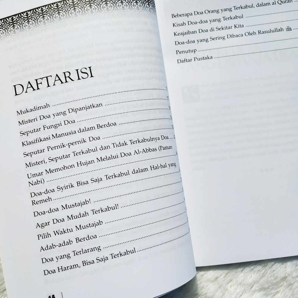 Buku ini juga mengungkap betapa proses doa itu diwarnai oleh berbagai misteri, yang kalau diselami dipahami secara baik oleh seorang muslim, sungguh akan mengubah suasana hatinya menjadi demikian teduh, tentram dan nyaman. Kebahagiaan pun menyeruak di depan mata, tumbuh begitu rimbun ibarat bebungaan di musim semi.