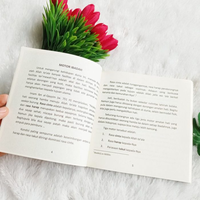 Jadi, motivasi pendorong hamba untuk beribadah itu perpaduan antara tiga unsur. Perasaan takut, harapan dan kecintaan. Temukan penjabaran ketiga unsur vital tersebut dalam buku sederhana ini! Motor lbadah. Selamat menikmati…