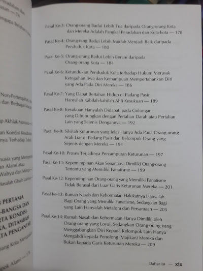 Dengan menyebut nama Allah Yang Maha Pengasih lagi Maha Pemurah. Buku ini berisikan tentang karya-karya mega-fenomenal dari cendekiawan muslim abad pertengahan Ibnu Khaldun, berikut di antara isinya: