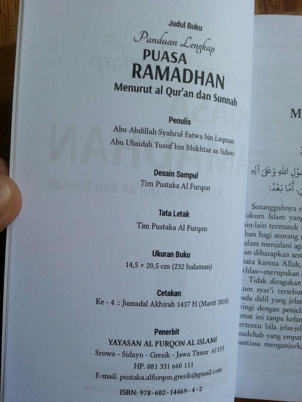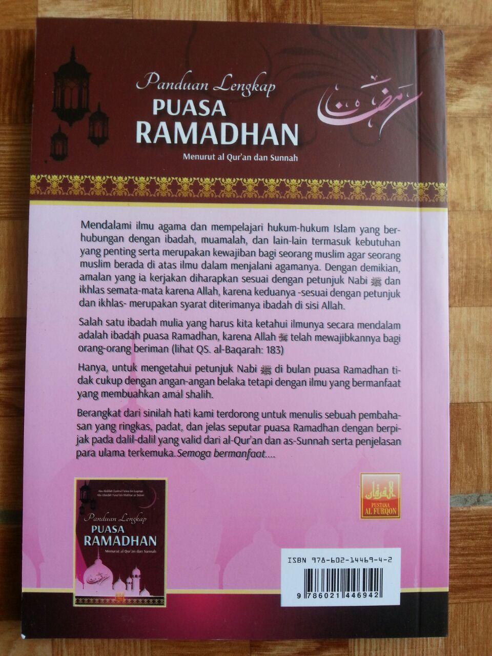 Berangkat dari sinilah buku ini hadir untuk Anda. Sang penulis menyakinan materi pembahasa di dalamnya secara ringkas pada, dan jelas seputar puasa Ramadhan, dengan berpihak pada dalil-dalil yang valid dari al-Qur’an dan as-Sunnah serta penjelasan para ulama terkemuka.