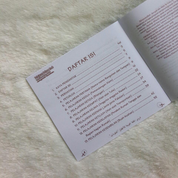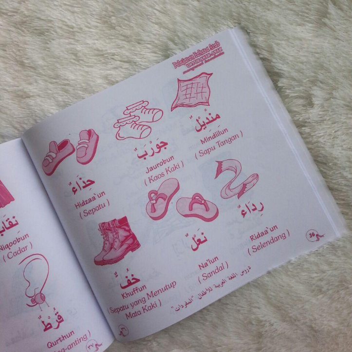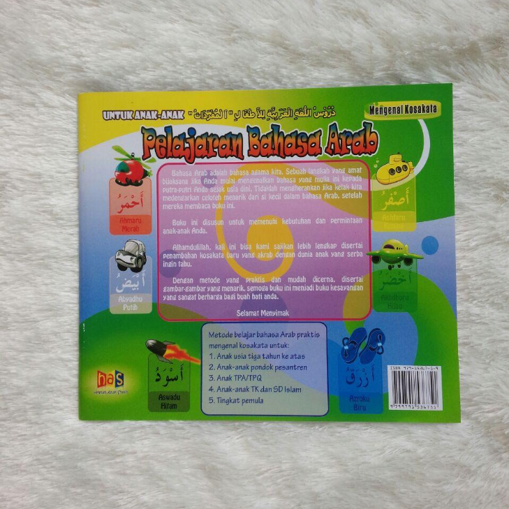 Bahasa Arab adala bahasa agama kita. Adalah sebuah langkah yang amat bijaksana jika anda mulai mengenalkan bahasa yang mulia ini kepada putra-putri anda sejak usia dini. Tidaklah mengherankan jika kelak kita akan mendengarkan celoteh menarik si kecil dalam Bahasa Arab setelah mereka membaca buku ini. Buku ini disusun untuk memenuhi kebutuhan anak anda. sejak cetakan keempat buku ini, kami bisa menyajikannya secara lebih lengkap dengan tambahan berbagai kosakata baru yang akrab dengan dunia anak yang serba ingin tahu. Buku ini menerapkan metode yang praktis dalam mengenal kosakata Bahasa Arab, diseertai dengan gambar-gambar yang menarik, untuk mempermudah pemahaman kosakata. Buku ini sangat cocok untuk: 1. Anak usia 3 tahun ke atas 2. Anak-Anak pondok pesantren 3. Anak-Anak TPA/TPQ 4. Anak-anak TK dan SD Islam 5. Pelajar Bahasa Arab tingkat pemula.