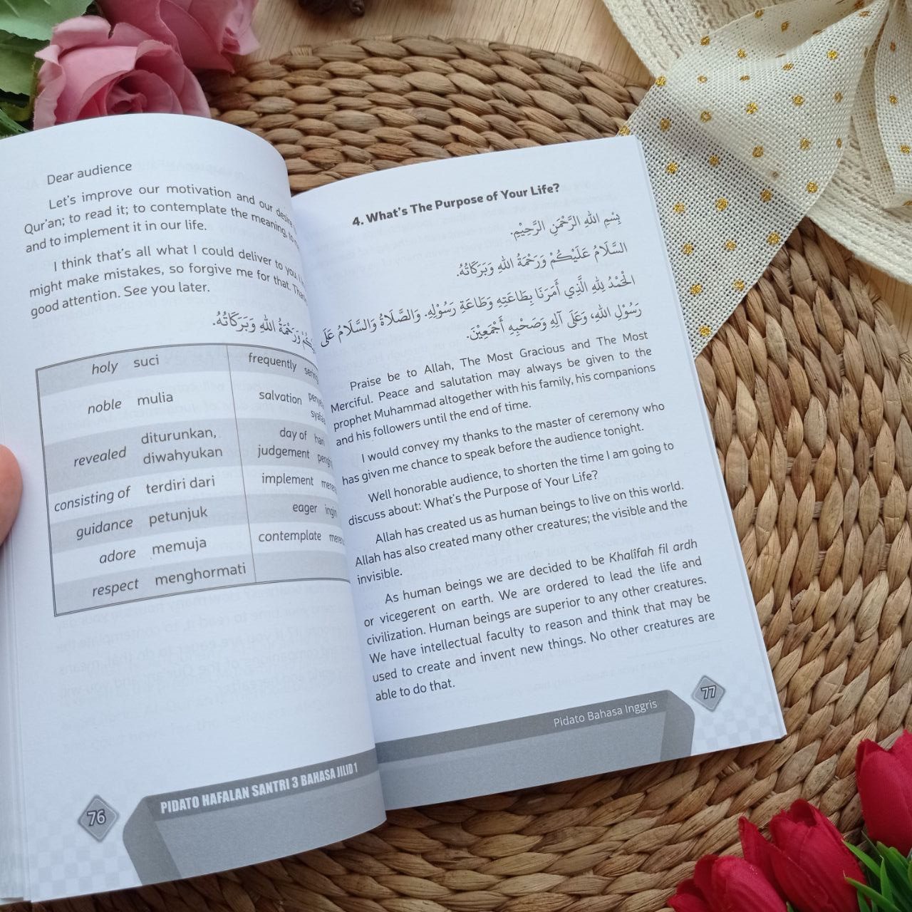 Nah, untuk memudahkan para santri dalam menyusun naskah pidato berbahasa Arab, Inggris, dan Indonesia kami hadirkan buku Pidato Hafalan Santri 3 Bahasa. Buku ini bisa menjadi modal pertama santri untuk menyiapkan naskah pidato 3 bahasa. Santri bisa menghafal naskah-naskah dari buku ini sebelum berpidato. Jika kelak sudah mahir, diharapkan santri bisa membuat sendiri dan mengembangkan cakupan pidato dengan tema-tema lainnya.