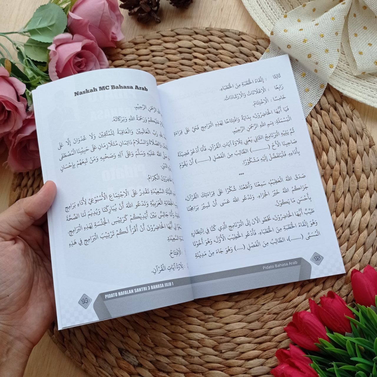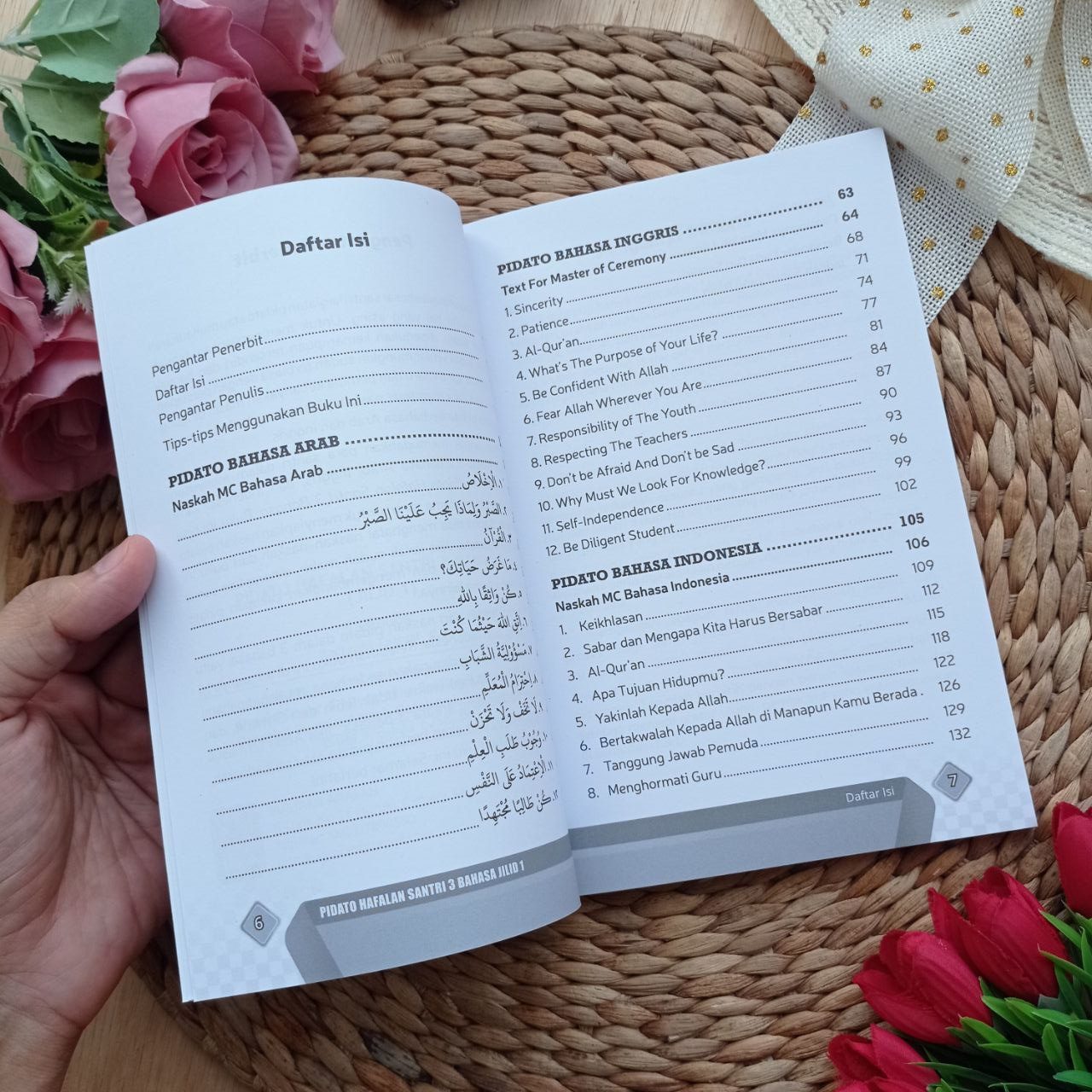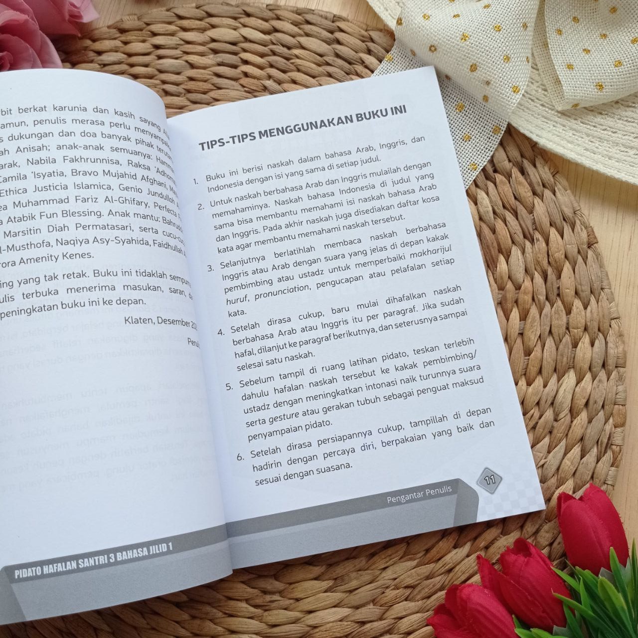 Nah, untuk memudahkan para santri dalam menyusun naskah pidato berbahasa Arab, Inggris, dan Indonesia kami hadirkan buku Pidato Hafalan Santri 3 Bahasa. Buku ini bisa menjadi modal pertama santri untuk menyiapkan naskah pidato 3 bahasa. Santri bisa menghafal naskah-naskah dari buku ini sebelum berpidato. Jika kelak sudah mahir, diharapkan santri bisa membuat sendiri dan mengembangkan cakupan pidato dengan tema-tema lainnya.