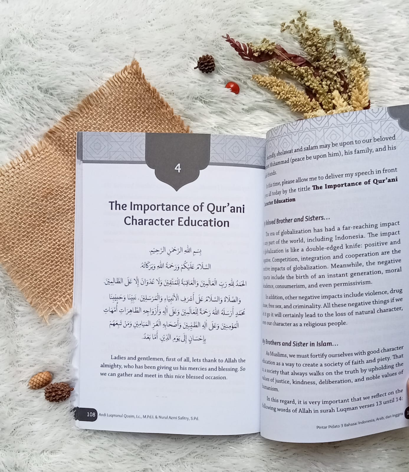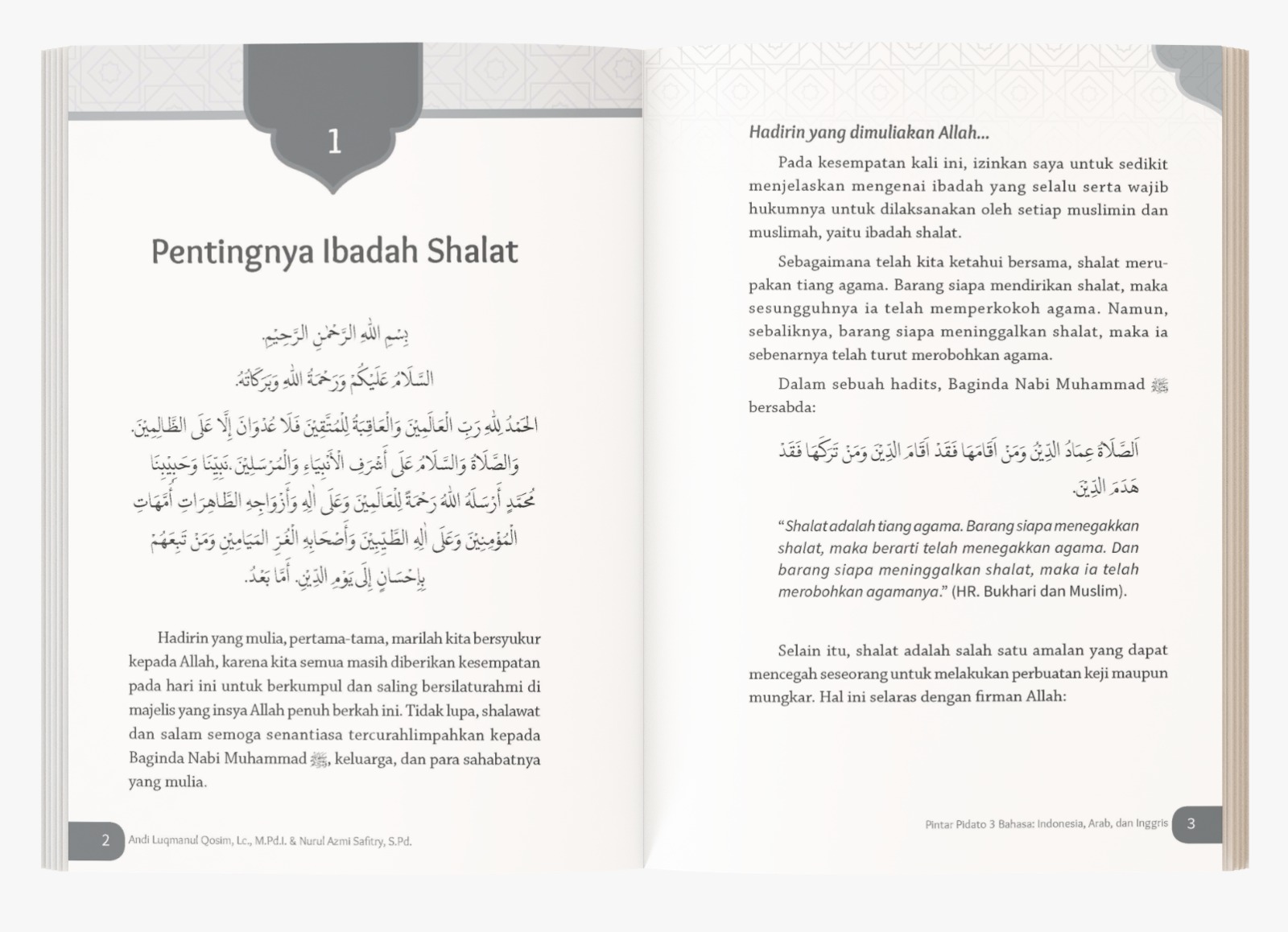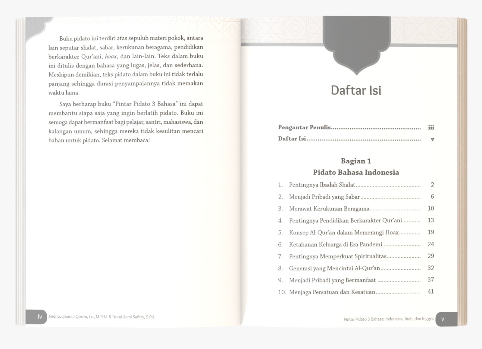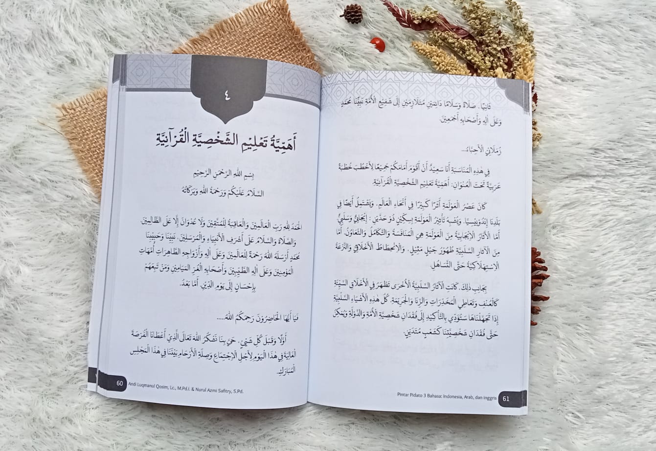 Buku ini tidak hanya menyajikan berbagai tema pidato yang menarik, seperti shalat, sabar, kerukunan beragama, dan pendidikan berkarakter Qur’ani, tetapi juga memberikan teknik dan contoh teks pidato dalam tiga bahasa: Indonesia, Arab, dan Inggris. Dengan begitu, pembaca dapat memperluas kemampuan bahasa mereka dan melatih kemampuan berbicara di depan umum secara multibahasa.