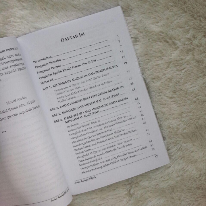Buku ini juga akan membantu Anda untuk menghafal Al-Qur’an dan memberikan rancangan hafalan, tabel harian dan ulangan hafalan. Karena di dalamnya terdapat langkah-langkah untuk menghafal Al-Qur’an dari awal surah Al-Baqarah hingga akhir mushaf Al-Qur’an