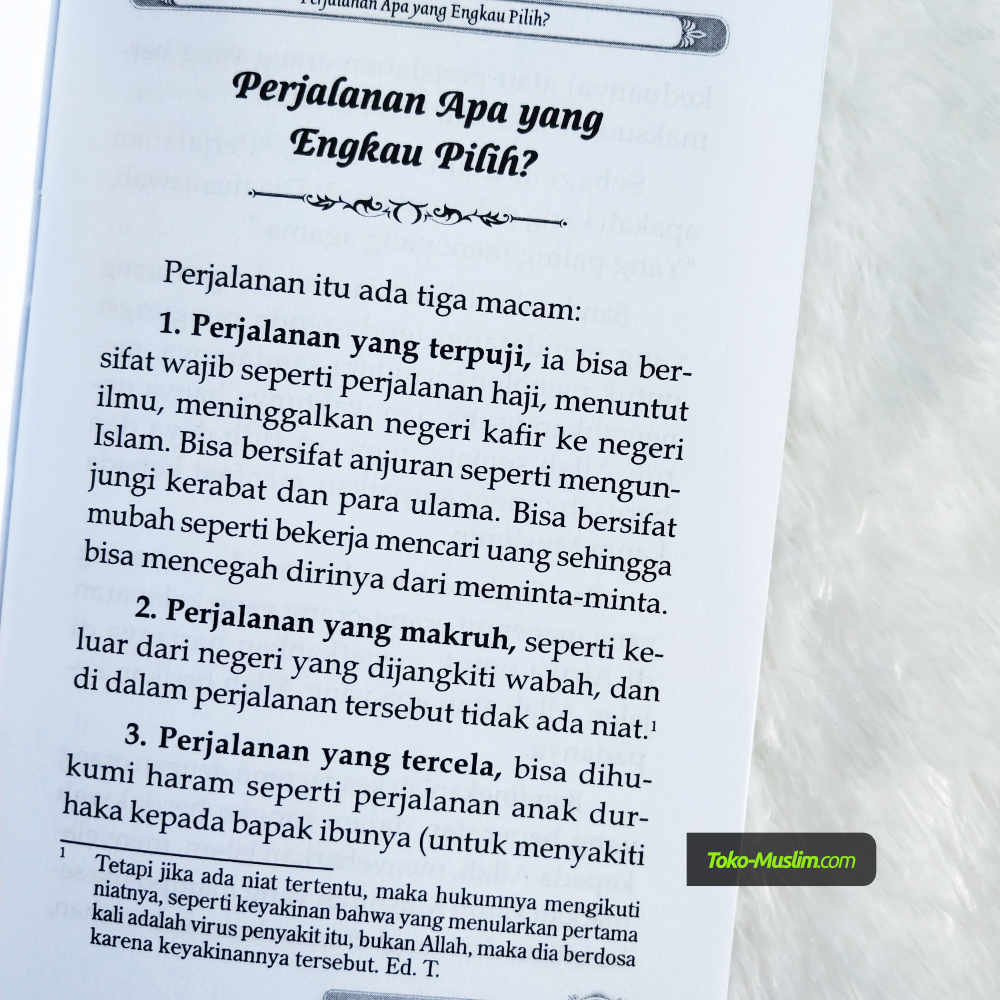 Buku ini merupakan tanggapan atas fenomena safar pada zaman modern ini yang telah mencampakkan hukum dan adab-adab safar. Dan bertolak dari sini, buku ini memberi pencerahan bagi generasi sekarang untuk bersafar sesuai tuntunan syariat dan menghindari pelanggaran aturannya demi keselamatan dirinya. Dan jikalau kita cermati secara seksama, semua aturan-aturan safar itu diberlakukan untuk kemaslahatan manusia itu sendiri.