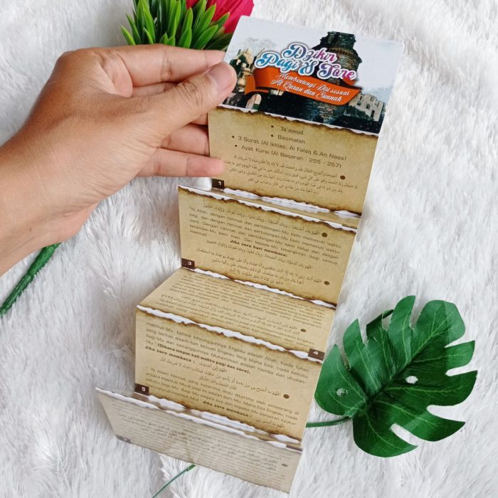 “Buku Saku Dzikir Pagi Dan Sore Lipat Membentengi Diri” ini berisi dzikir yang sesuai dengan Al-Qur’an dan As-Sunnah yang didesain dengan ukuran yang praktis simpel dan mudah dibawa untuk dihafal dan diamalkan dengan bentuk lipat mudah untuk di saku atau di kantong baju.