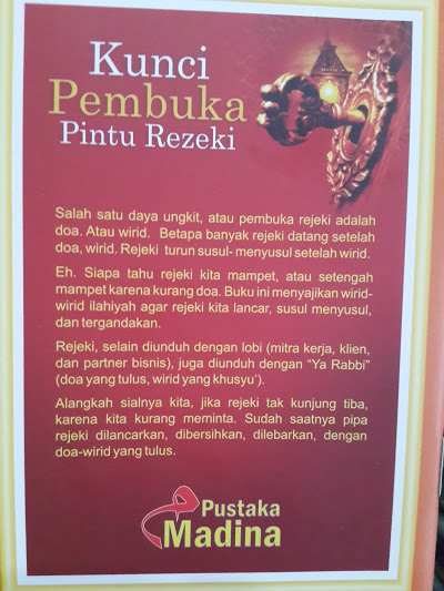 Buku saku ini akan memberikan nasihat dan kunci bagaimana pintu rezeki dapat terbuka lebar, berkah rizki bisa didapatkan. Berikut ini sebagian cuplikannya: