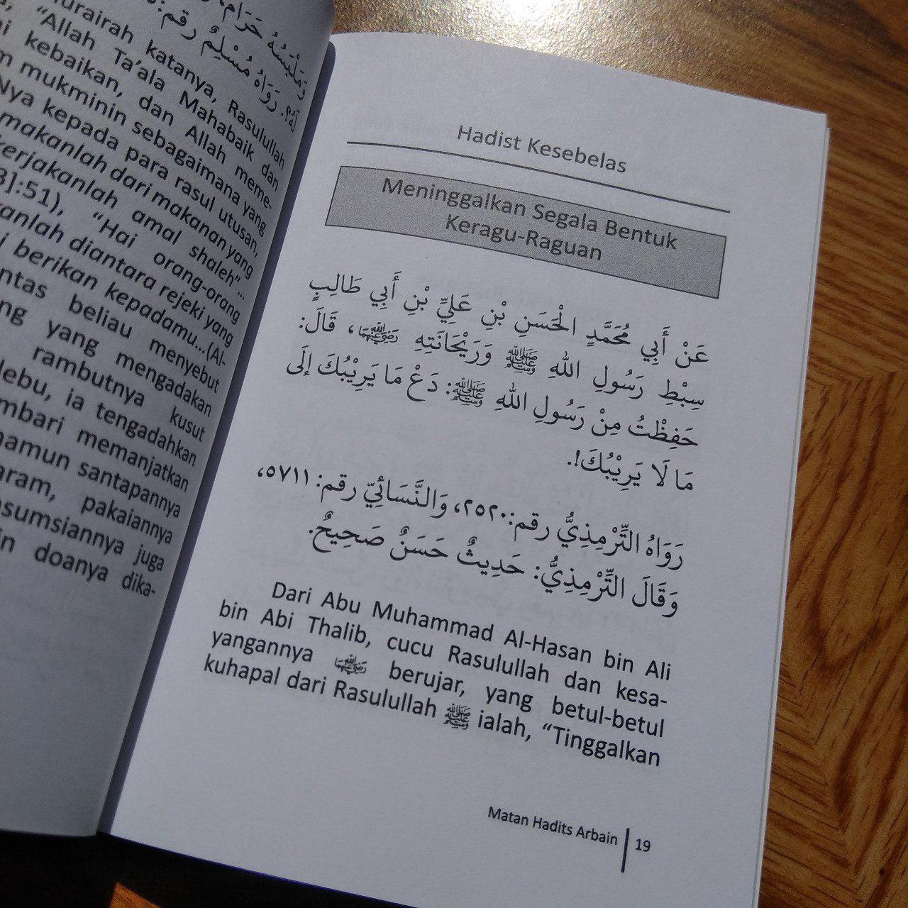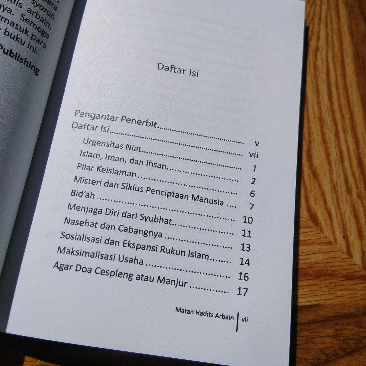 Buku ini berjudul “Buku Saku Matan Hadits Arbain Imam An-Nawawi” , Buku ini merupakan salah satu karya Imam An-Nawawi. Merupakan kumpulan hadits-hadits Nabi pilihan, dan merupakan jawami’ul kalim yang memiliki keutamaan dalam pembahasan yang singkat dan padat. Di dalamnya berisi 40-an hadits yang mencakup segala urusan dan kebutuhan umat Islam di dunia dan di akhirat, baik di sisi akidaH, muamalah, hukum, syari’ah, dan akhlak.