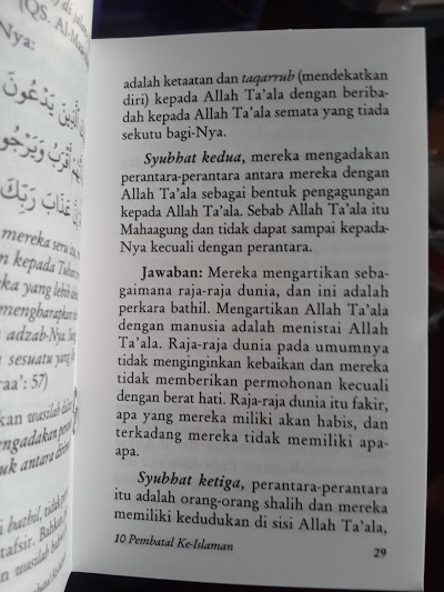 Jika maksudnya bahwa harus ada perantara dalam menyampaikan risalah (yakni Rasulullah sebagai penyampai risalah) antara kita dengan Allah maka ini benar dan harus. Barang siapa mengingkari-nya, maka ia kafir menurut Ijma. Apabila ada perantara yang barang siapa menetapkannya, maka ia kafir menurut ijma, yaitu mengadakan perantara antara dirinya dengan Allah, ia berdoa kepada mereka, memohon syafaat kepada mereka dan bertawakal kepada mereka , karena tidak ada perantara antara Allah dengan para hamba-Nya dalam beribadah